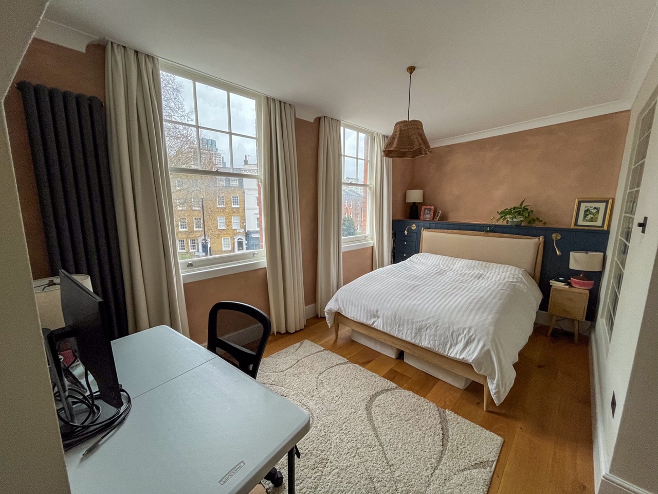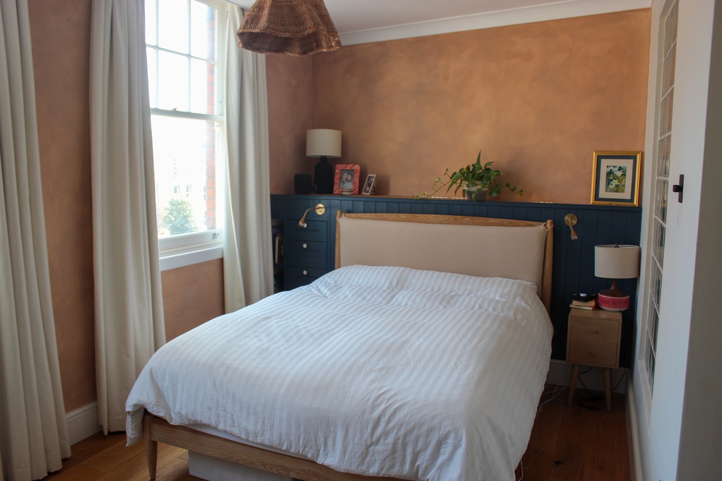 The bedroom is larger than average and has been designed as a calm, tranquil retreat. It includes bespoke fitted wardrobes, a storage unit behind the bed, convenient reading lights, and ample space for a desk and additional storage.