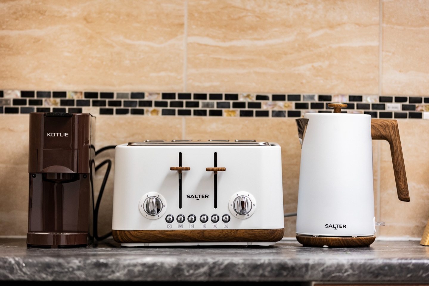 The flat features a modern kitchen with fridge, cooker, oven, microwave, coffee maker, toaster, and dining area. Includes WiFi, TV, washing machine, heating, bed linen, and towels.