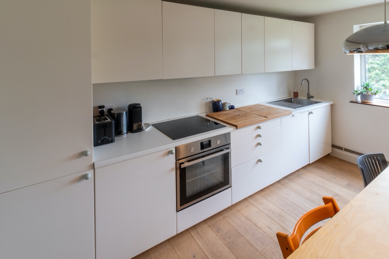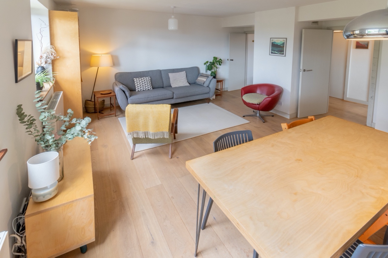 The spacious kitchen is fully equipped with an integrated full sized fridge / freezer, a dishwasher, an induction hob with integrated extractor fan and integrated oven. There is a lot of storage and worktop area within the kitchen with a large dining table. The open plan connects to the living area and comes with a large built-in plywood library and three seater comfy sofa.