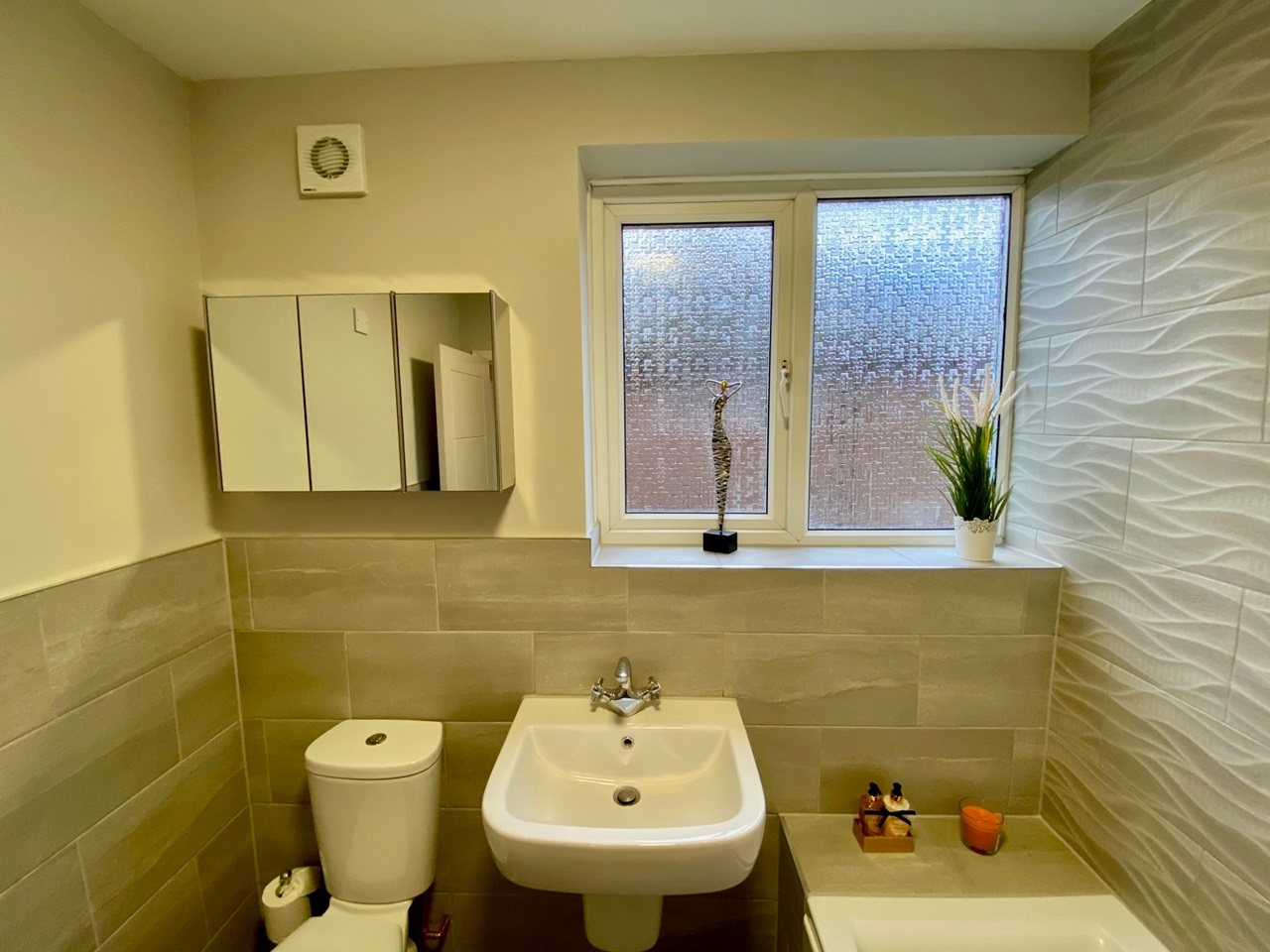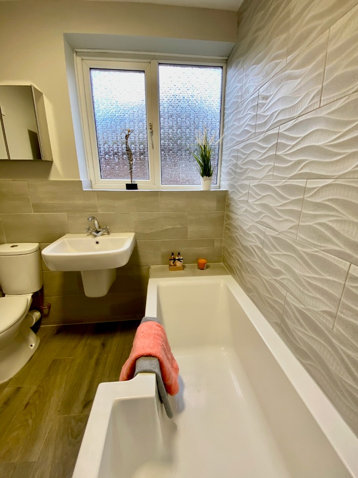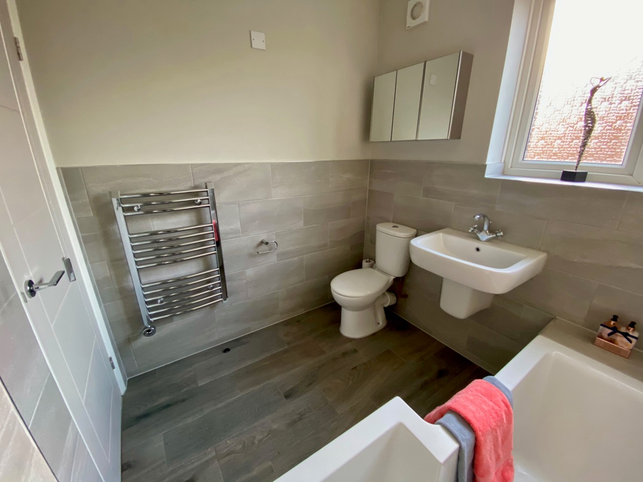 Bathroom – 3-piece white suite with shower bath and waterfall shower and towel radiator