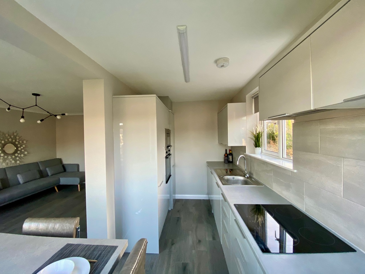 The front door opens into bright spacious entrance hall flooded with light - A warm welcome! All the rooms are finished in a warm shade of grey, with laminate flooring creating a fresh modern feel. The large lounge leads to the kitchen and is joined by a breakfast island which seats 3/4 people. The kitchen discrete kitchen boasts a full suite of integrated appliances giving a sleek, contemporary feel. The apartment benefits from:-