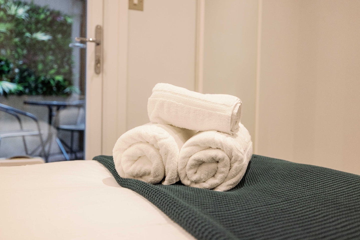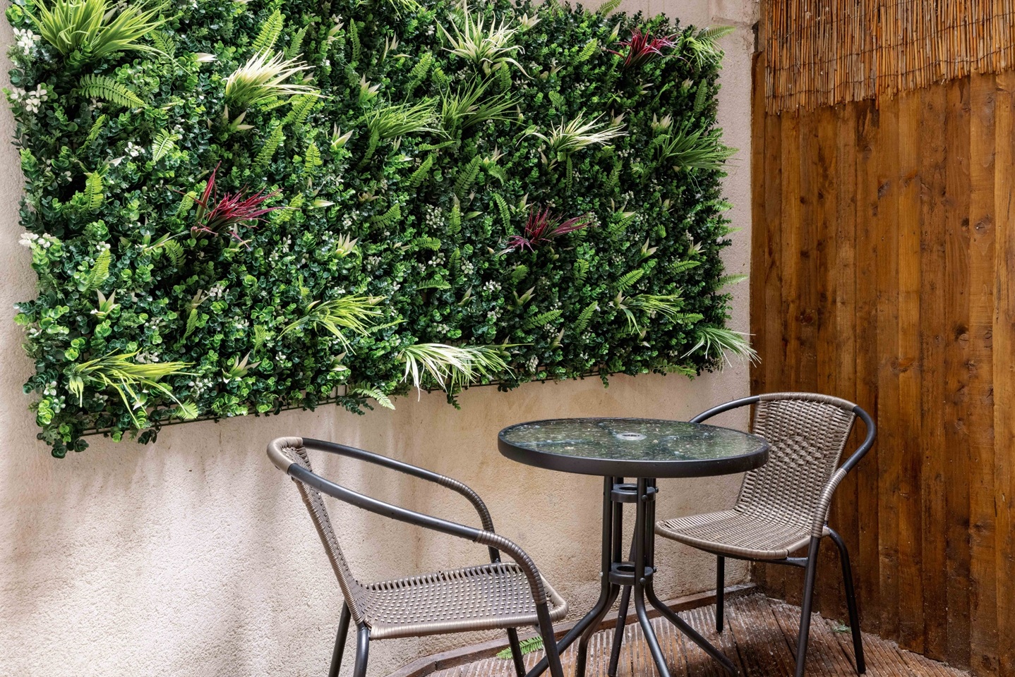 The main bedroom features a king-size bed, wardrobe, chest of drawers, dressing table, full-length mirror, bedside lighting, and a Smart TV. The second bedroom includes a double bed, wardrobe, chest of drawers, bedside lamps, and direct access to the private outdoor space.