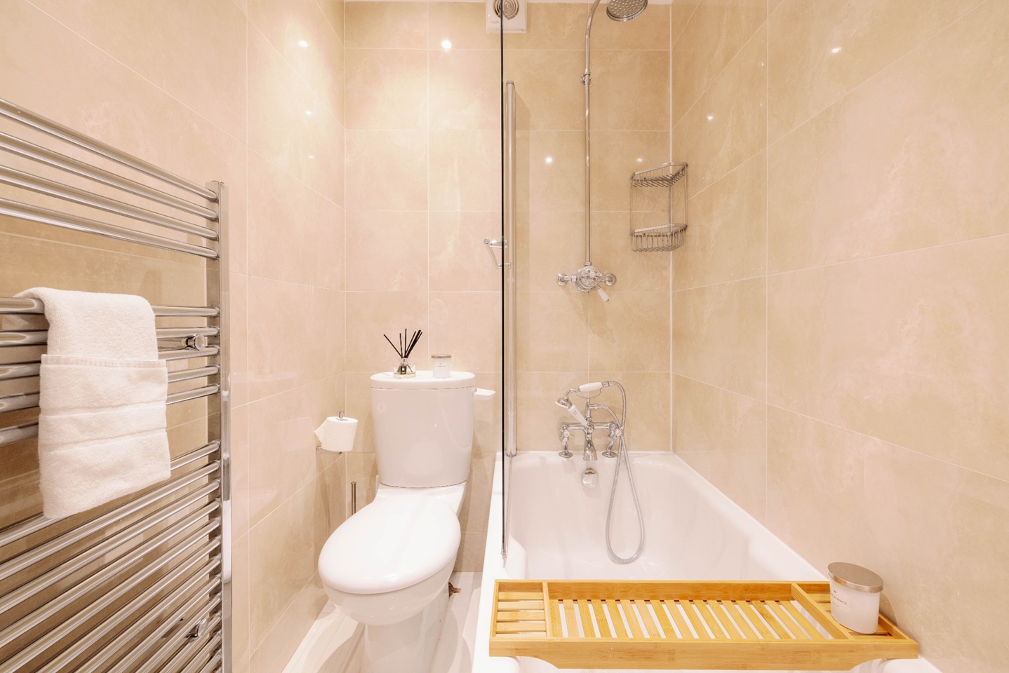 The bathroom is modern and well laid out, with a bath and overhead shower, sink, toilet, and mirrored storage cabinet. The property also benefits from a private patio with outdoor seating — a quiet and welcome feature in this central London location.