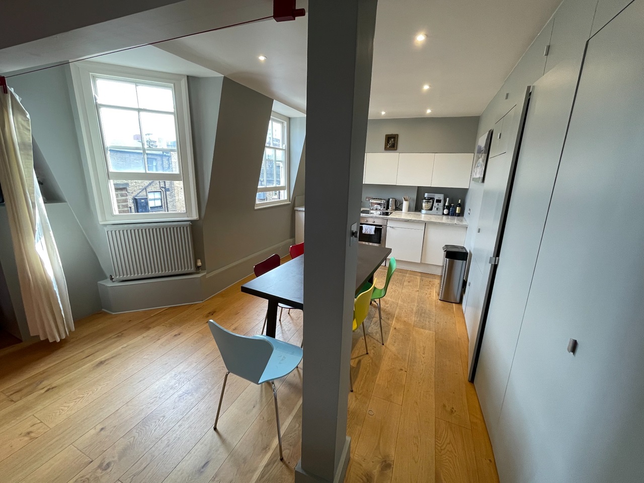 A recently refurbished, very bright, modern two bedroom, two bathroom apartment situated in the heart of London with Oxford Street and Fitzrovia's shops, Regent's park, restaurants and bars nearby. The street itself is however very quiet.