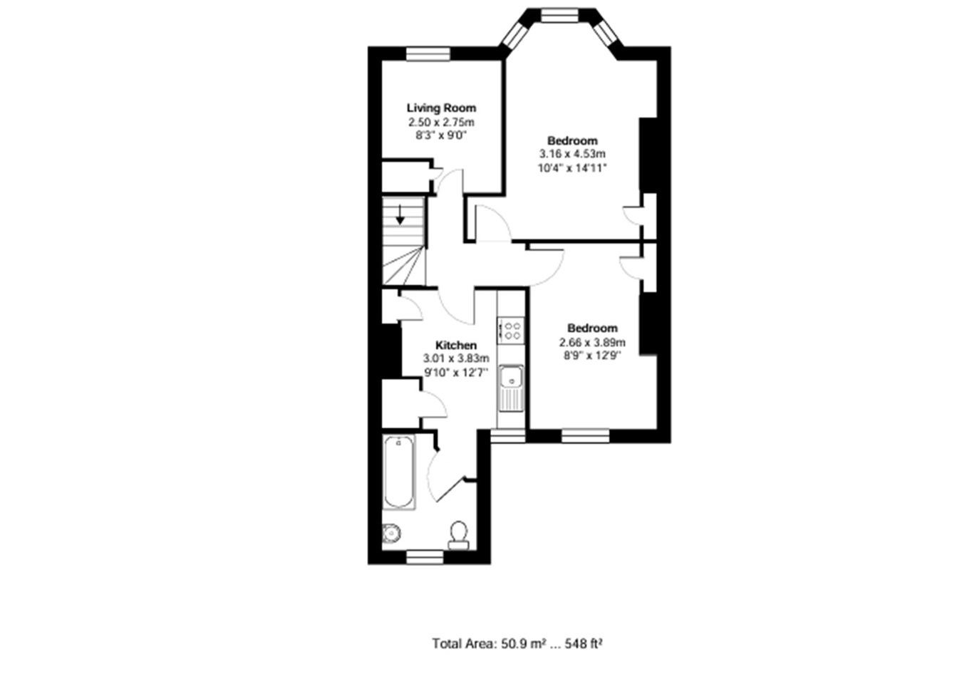 This cozy house boasts a well-proportioned kitchen, two comfortable bedrooms providing ample space, and a well-appointed bathroom, ensuring functionality and convenience for residents.