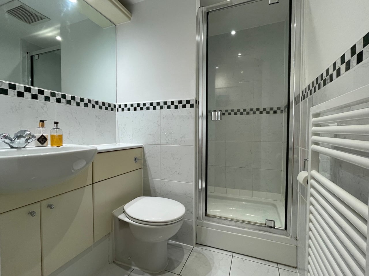 The flat has a large combined living and dining room, with balcony, which is furnished with a corner sofa, wall-mounted TV and a dining table big enough for six. This opens into a separate kitchen with black granite worktops, a new electric oven and induction hob, plus a dishwasher, washer dryer, fridge freezer and microwave. There are two generous double bedrooms. The first has an ensuite bathroom and is fitted with a double bed, drawers and built-in wardrobes. The second has a king-sized bed, plus wardrobe, large desk and bookcase. There is also a shower room, and two separate storage cupboards, one of which houses the new electric hot water tank.