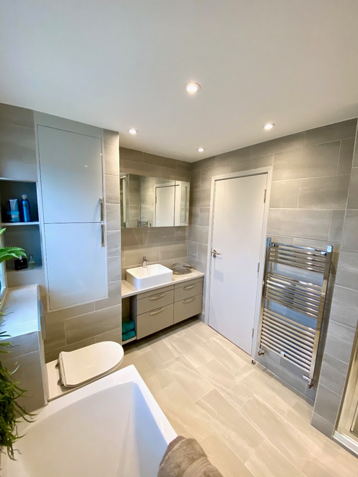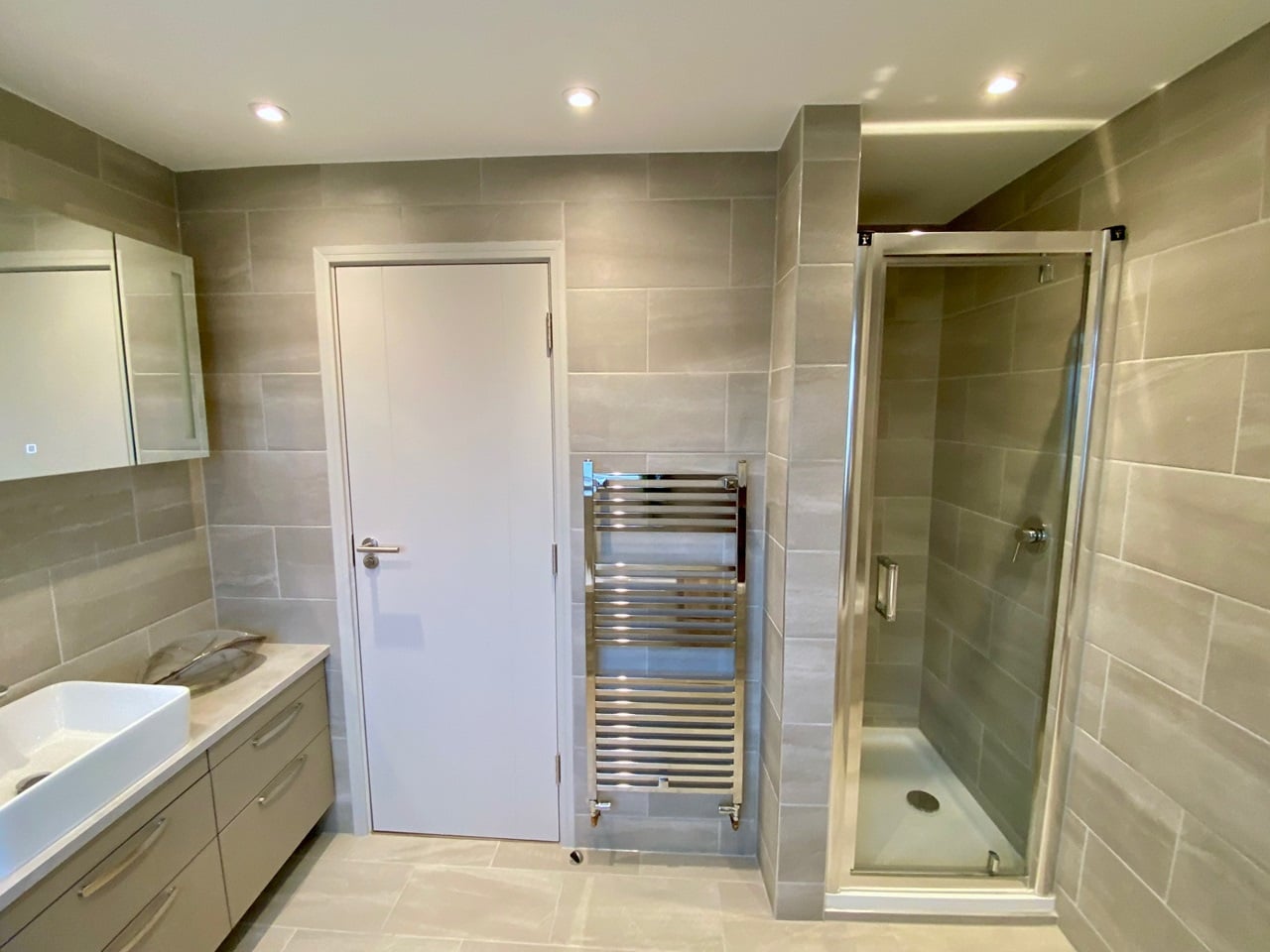 Fully tiled 3-piece bathroom with bath, walk-in shower cubicle with rainfall shower. The large towel radiator run from the gas central heating system. There is a sleek vanity countertop sink with two vanity units in addition to a spacious glass fronted bathroom cabinet with integrated lighting and shaver socket.