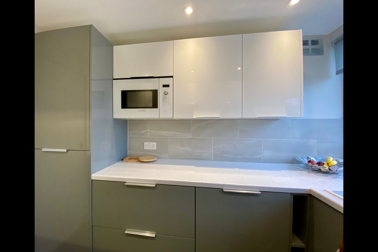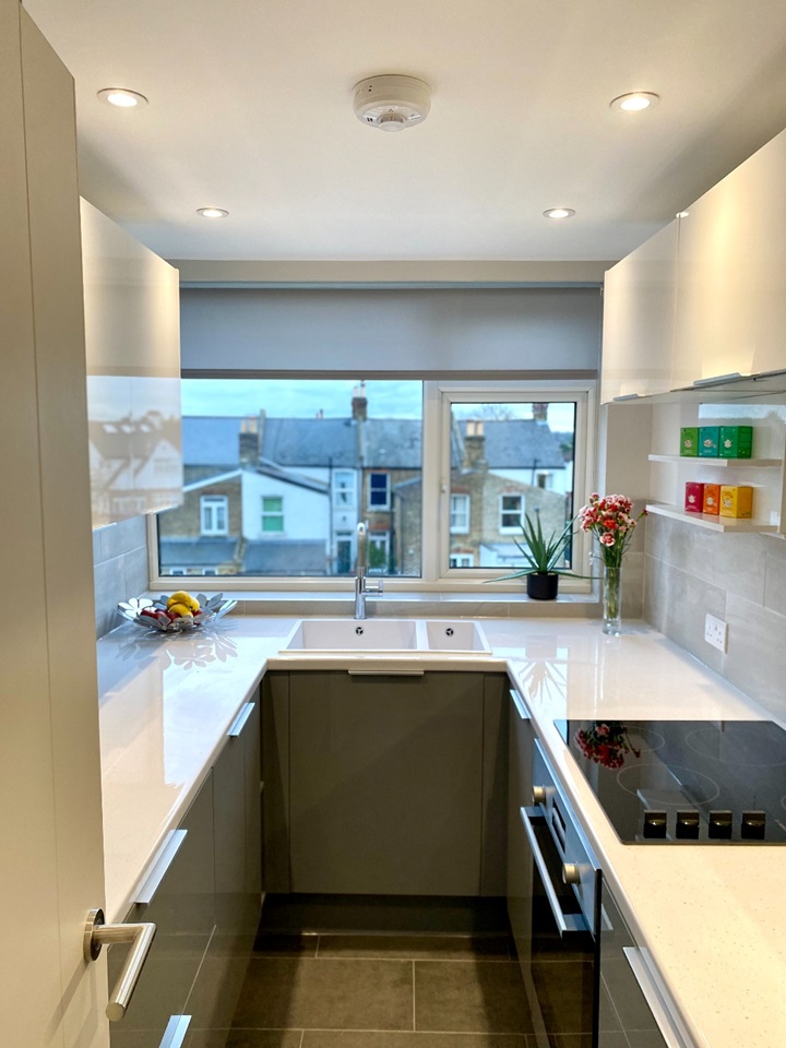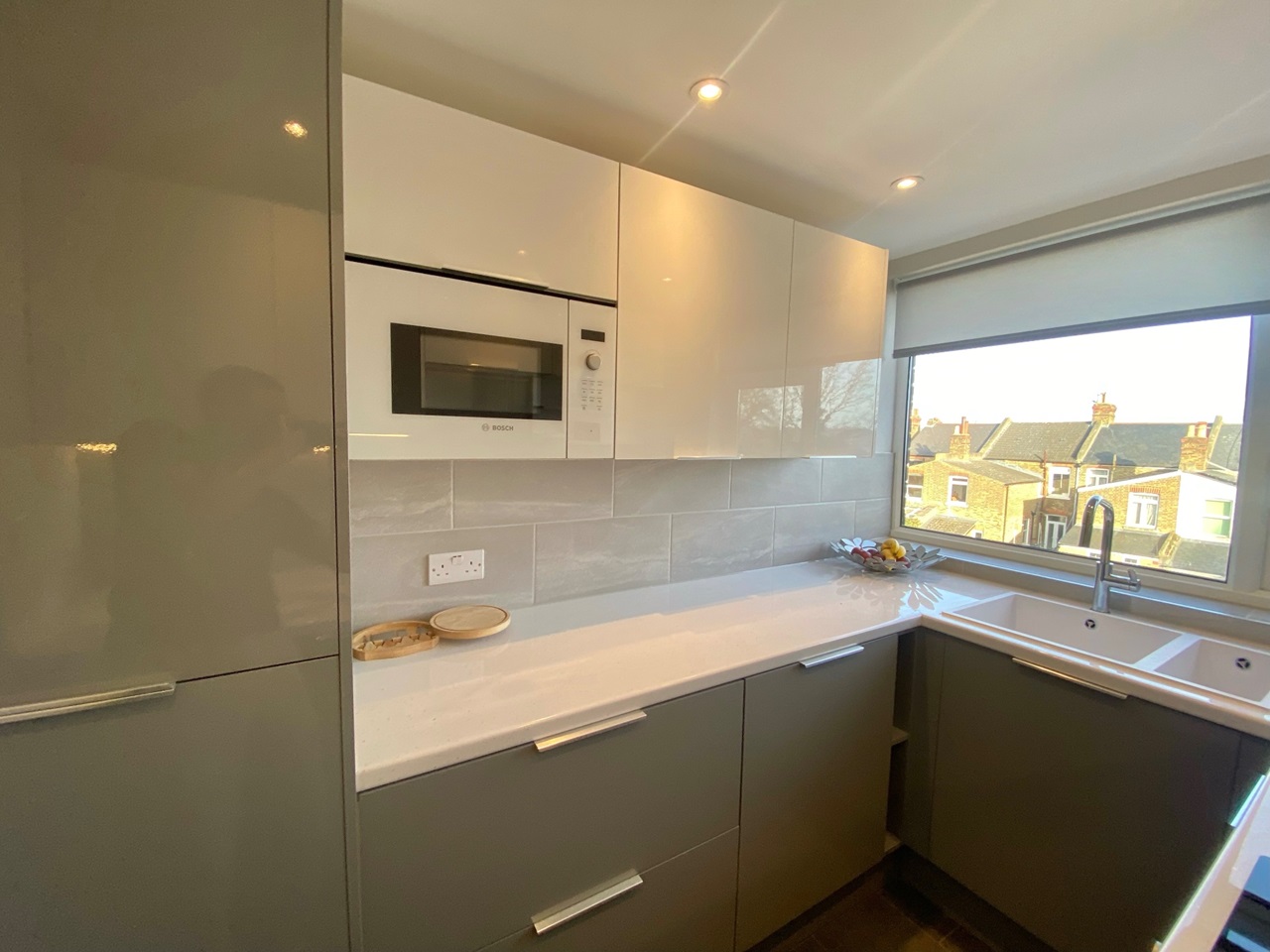 High gloss white and anthracite grey fitted kitchen with fully integrated appliances: