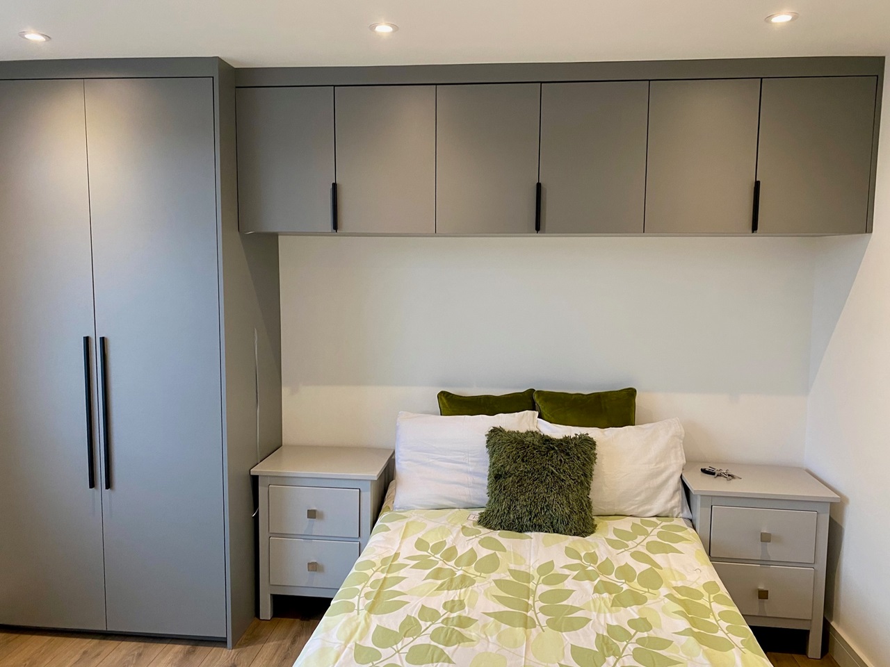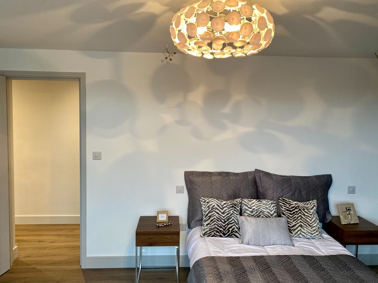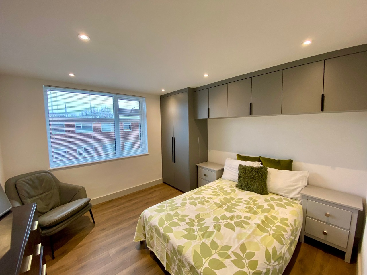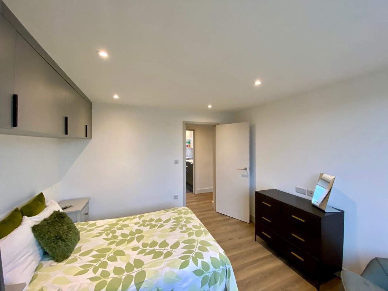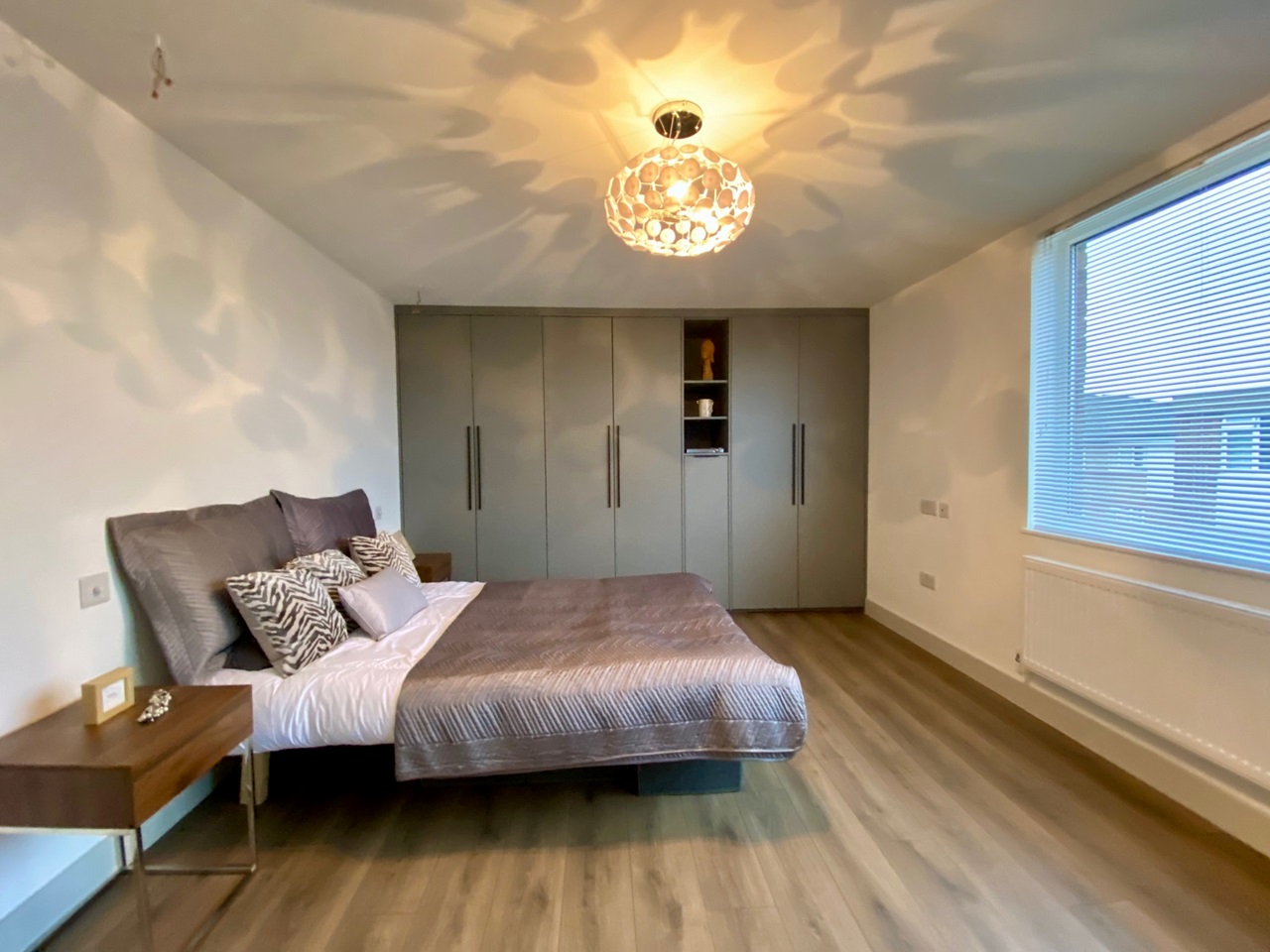 Large double bedroom with floor to ceiling fitted wardrobes and high-level cupboards allowing maximum flexibility to use the space as a bedroom with desk or a office/spare room. Wired for TV point and internet.
