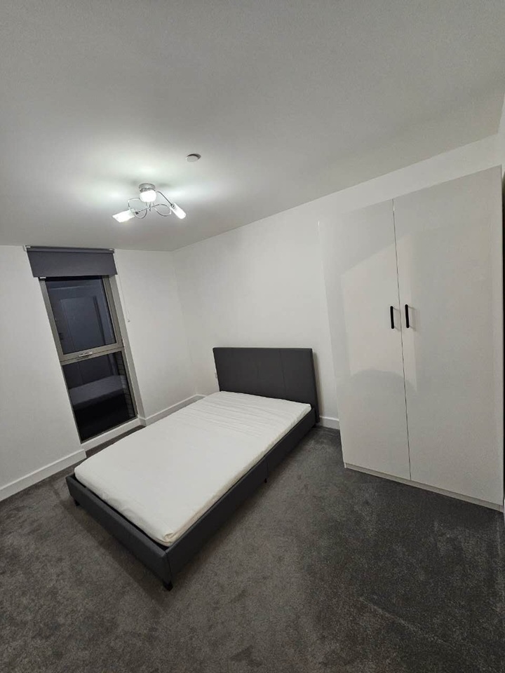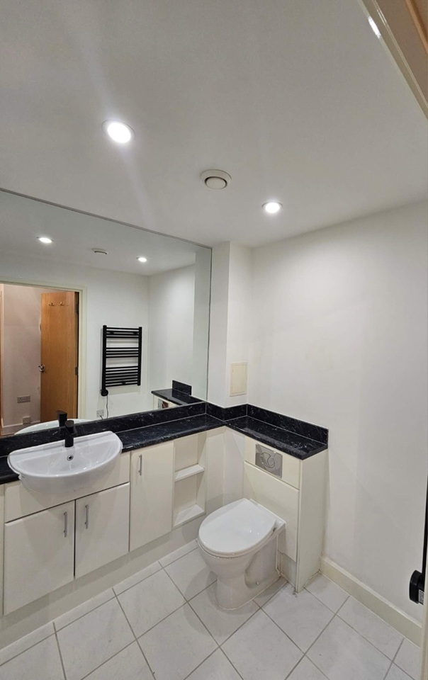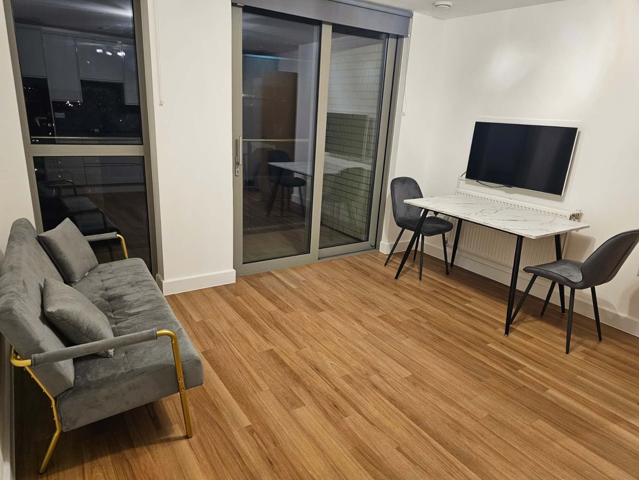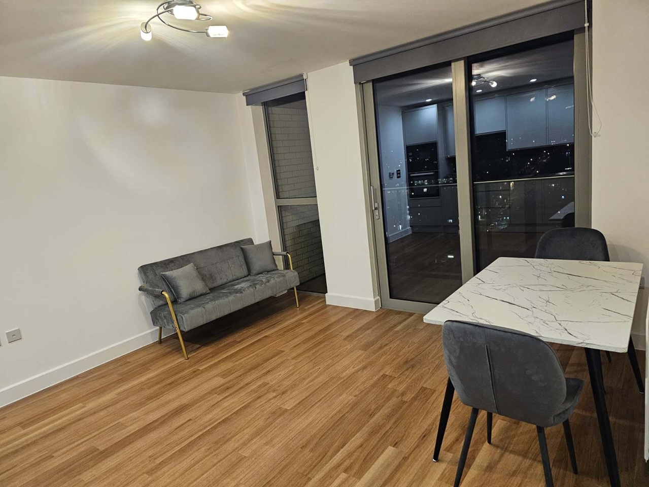 The apartment features a bright open-plan reception, dining, and kitchen area with newly fitted appliances, opening out to a private balcony. Both bedrooms are generously proportioned, with the principal room offering slightly larger dimensions, and the second bedroom providing excellent flexibility for guests or working from home. A sleek bathroom has recently been upgraded with a new bath and shower installation, complementing the clean, contemporary finish throughout the home.