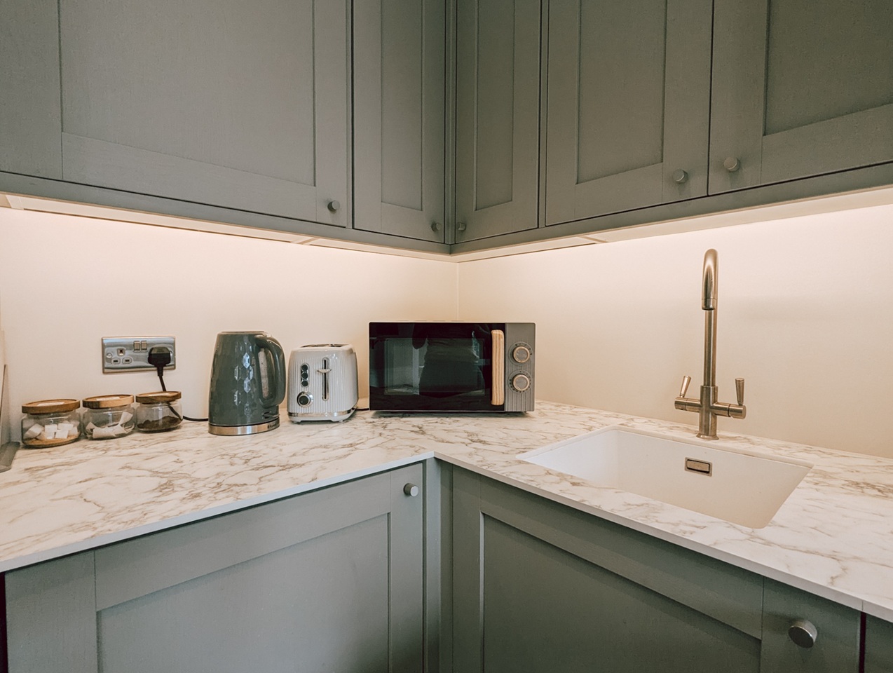 Fully equipped kitchen with dishwasher, oven, microwave, fridge/freezer, kettle, coffe machine