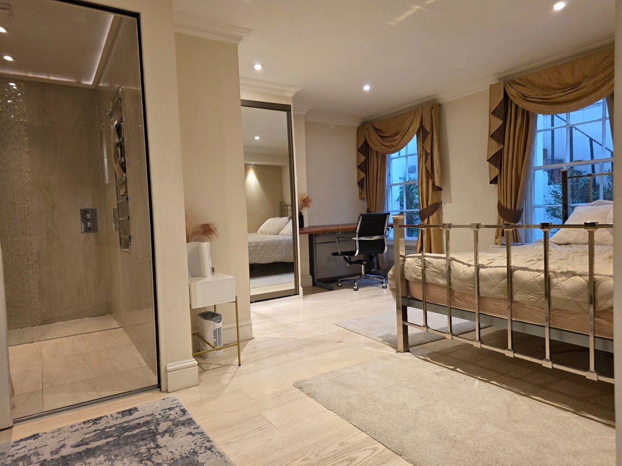 - An exceptionally large master bedroom with a luxurious ensuite with a walk in shower. The room benefits from beautiful bespoke floor to ceiling fitted wardrobes to take care of all your storage needs. There is also a bespoke custom fit electric controlled sit stand desk in this room.