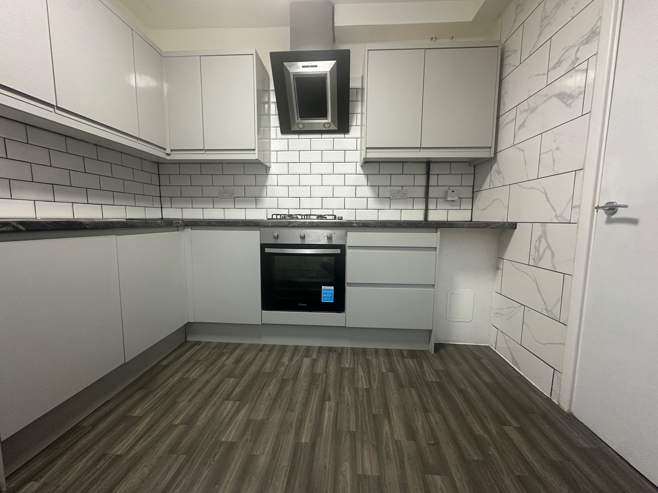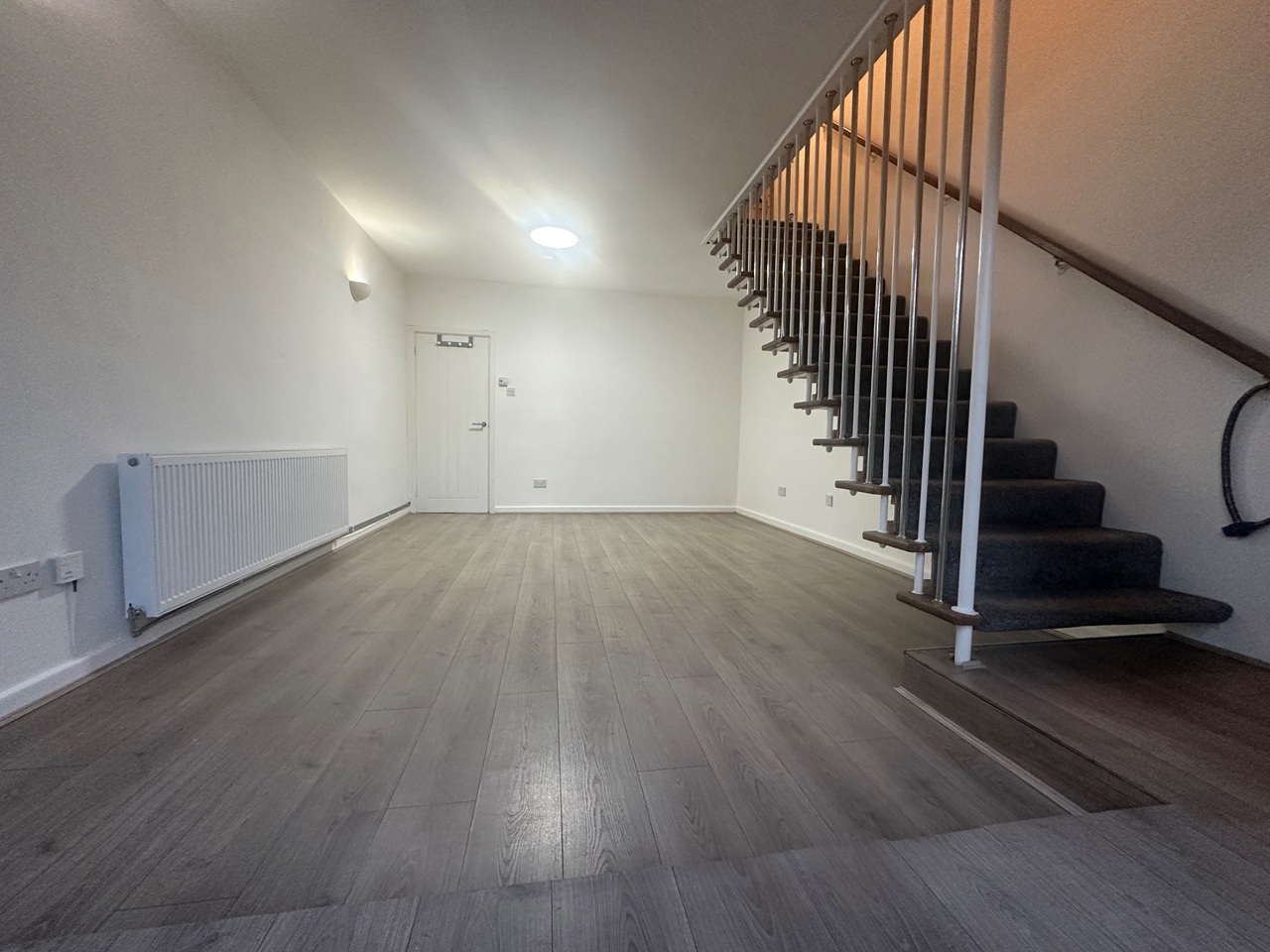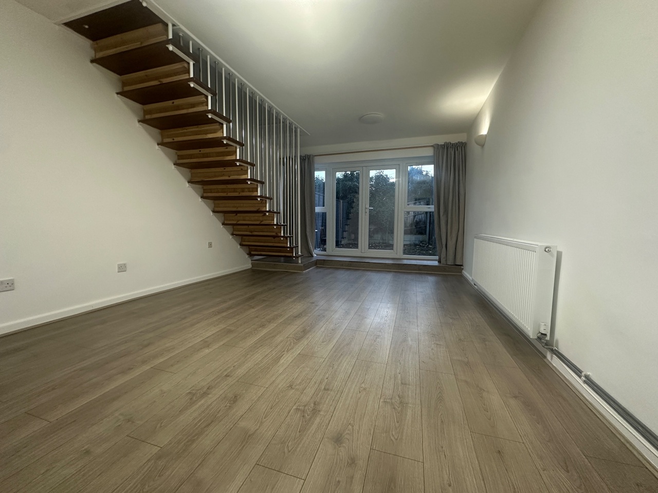 The ground floor offers a bright, spacious open-plan living room with wooden flooring and patio doors leading to the private rear garden. The modern kitchen features ample storage, integrated oven and hob, and generous worktop space. Upstairs includes a well-proportioned master bedroom and a refurbished bathroom.
