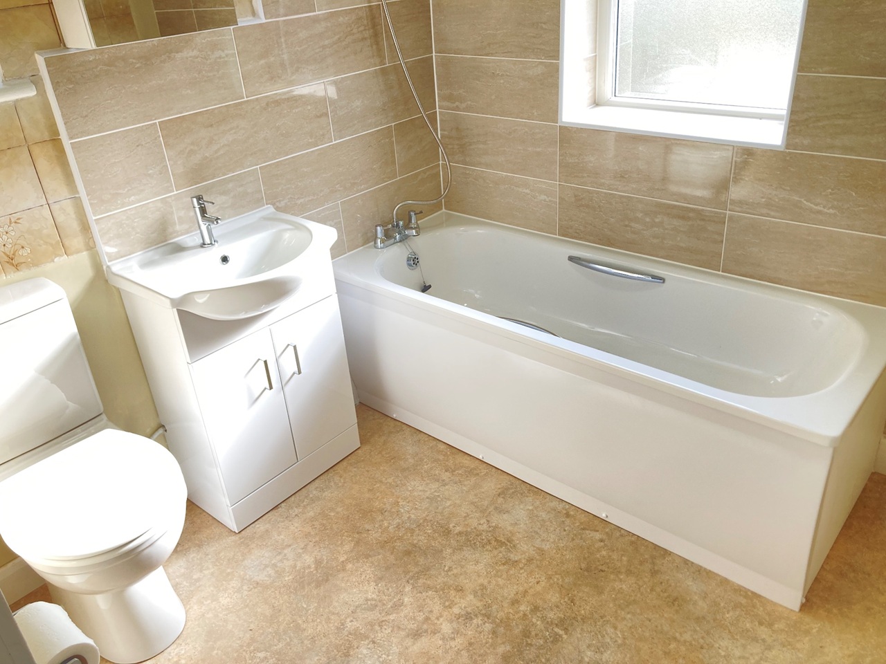 Ceramic Floor and Wall Tiled Bathroom Suite with Bath, Shower, Basin Mixer Taps, Heated Towel Rail