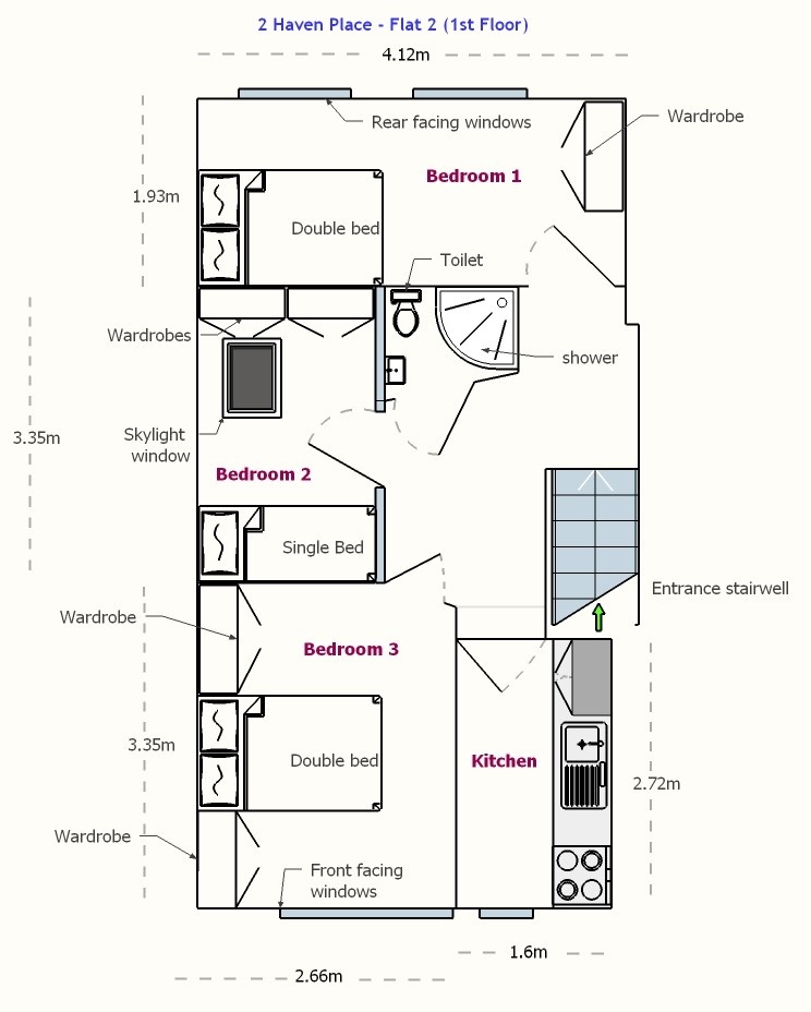 2 Double Rooms and 1 Single. 1 Kitchen and bathroom.