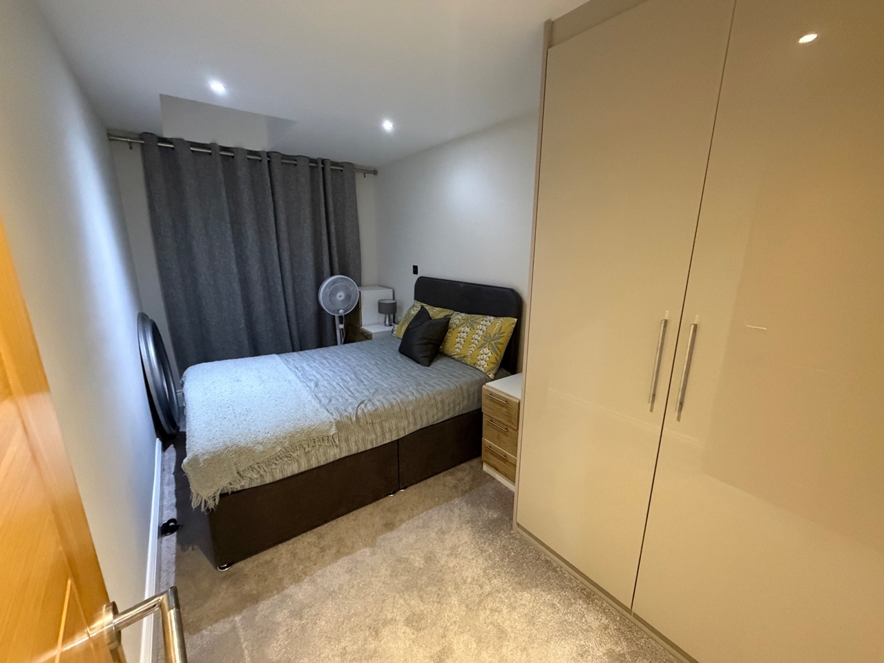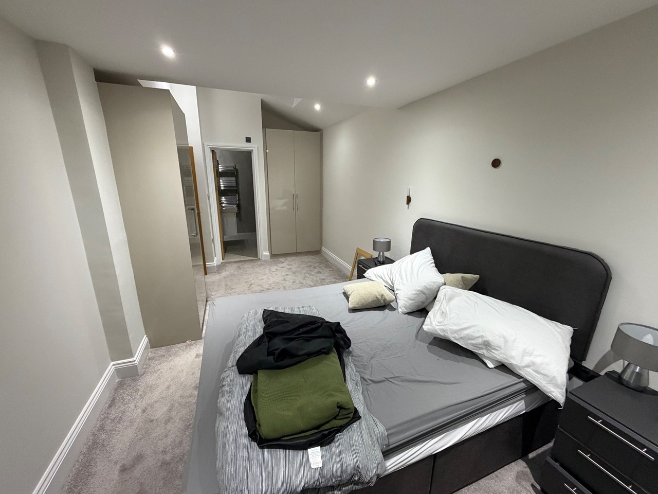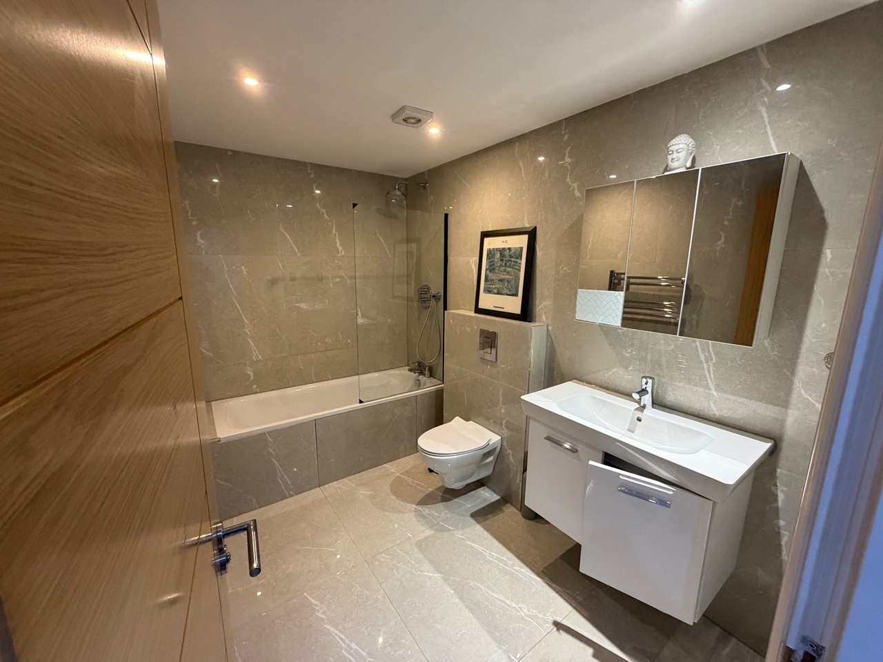 The flat features a bright, open-plan living and dining area with a stylish fitted kitchen and integrated appliances, ideal for relaxing or entertaining. Both bedrooms are generously sized, with the master bedroom benefiting from a private en-suite bathroom. The interiors are finished to a high standard, with tasteful furnishings and quality materials throughout.
