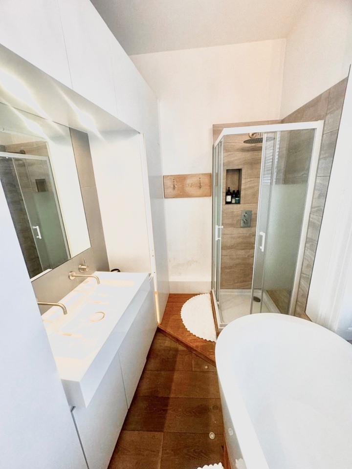 - Main bedroom with built-in wardrobes, large windows, and a luxurious en suite (freestanding bath, rainfall shower, and chandelier)