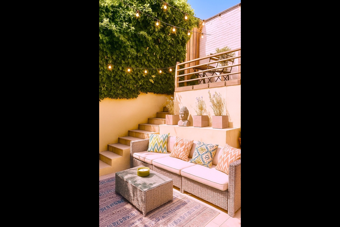 - Large French doors open to a private, two-level garden with outdoor seating