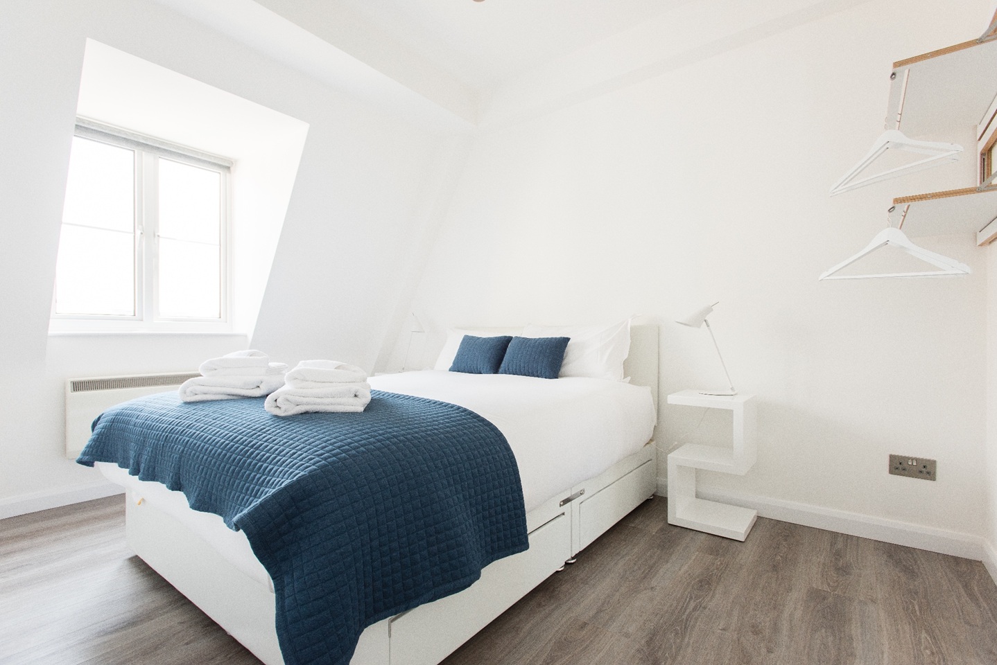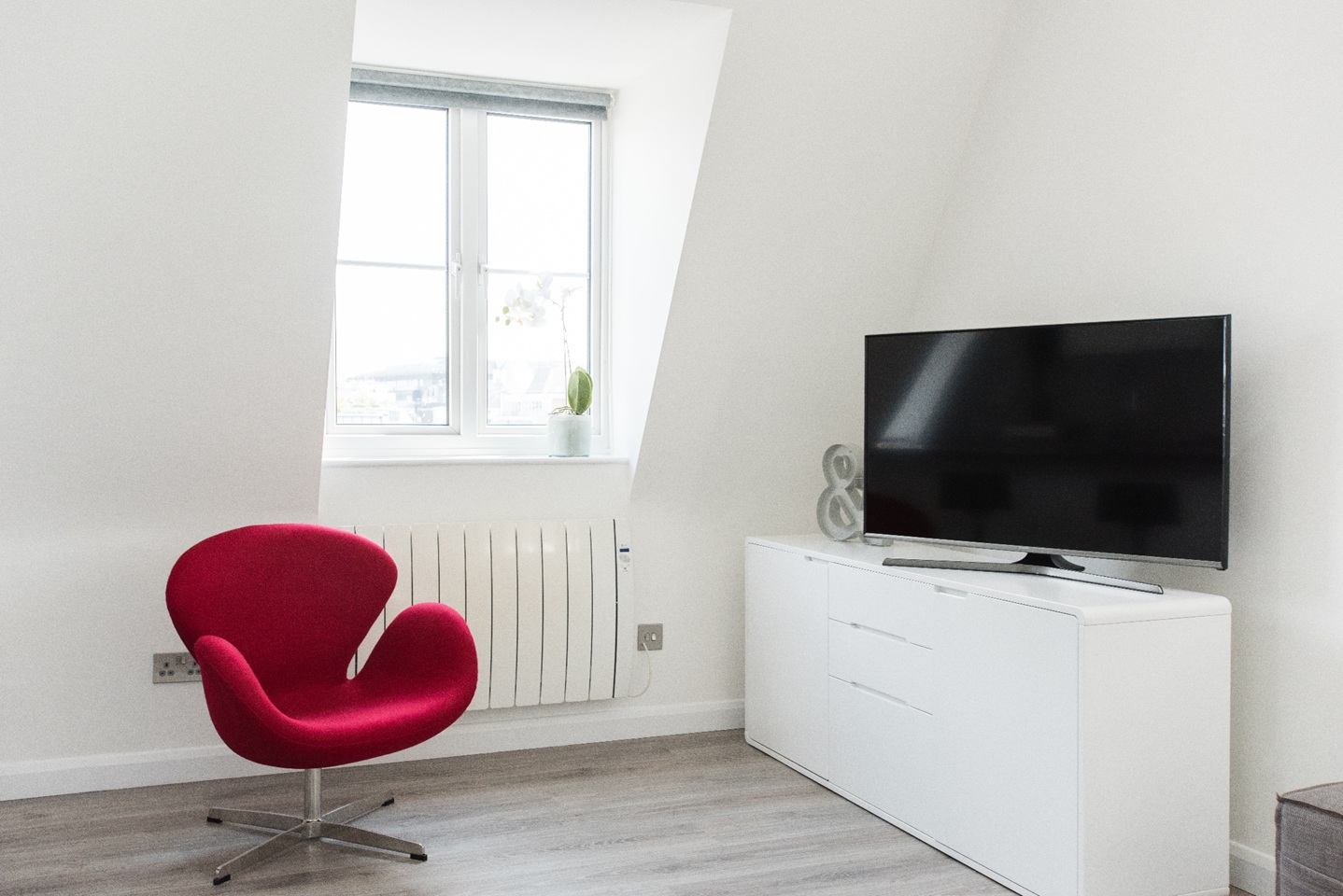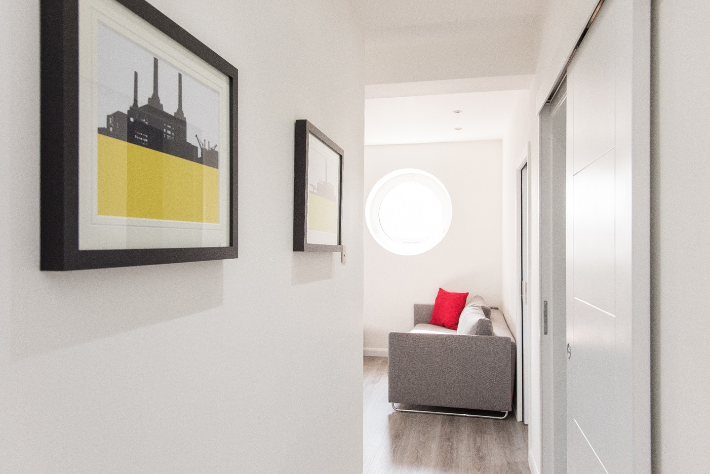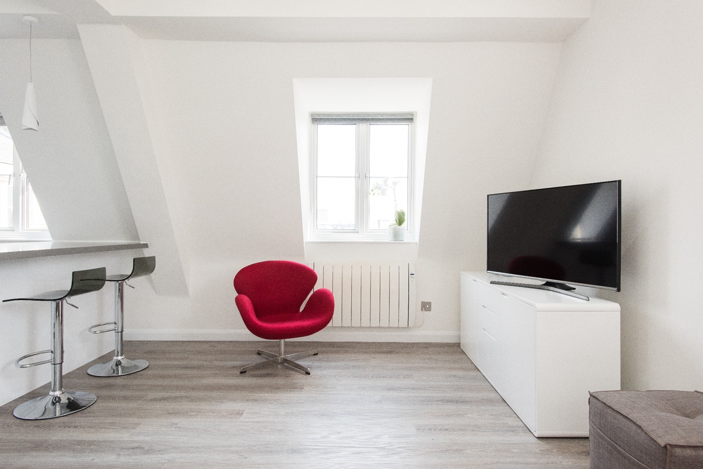 This apartment has very modern furnishings with crisp white walls and stylish tiling in the bathrooms. The living room is very bright and spacious with large windows giving the space a very airy feel. The open plan kitchen has all appliances neatly built into wall mounted cabinet. A kitchen bar sits right across the kitchen space with pendant lights hanging over. It's the perfect spot to perch up on for a morning cup of coffee or a yummy meal at the end of a long day of sightseeing around London. The kitchen is fully equipped with all your culinary requirements to ensure you can enjoy cooking your own meals to feel more at home. A brand new sofa adorns one side of the living room that you can pull out at night to have two additional people sleep, should you need the extra space.