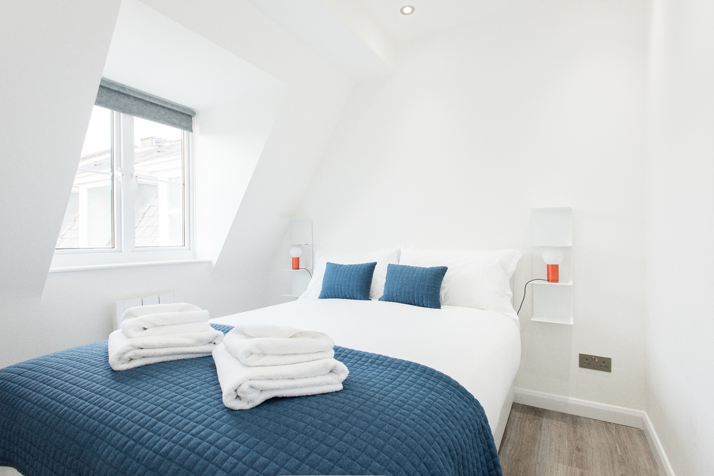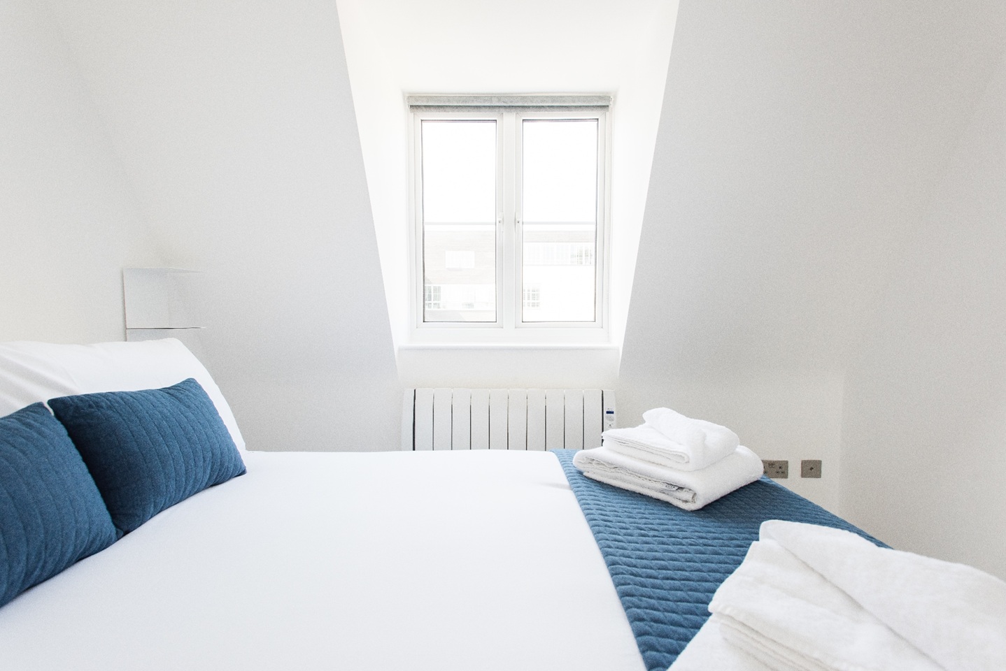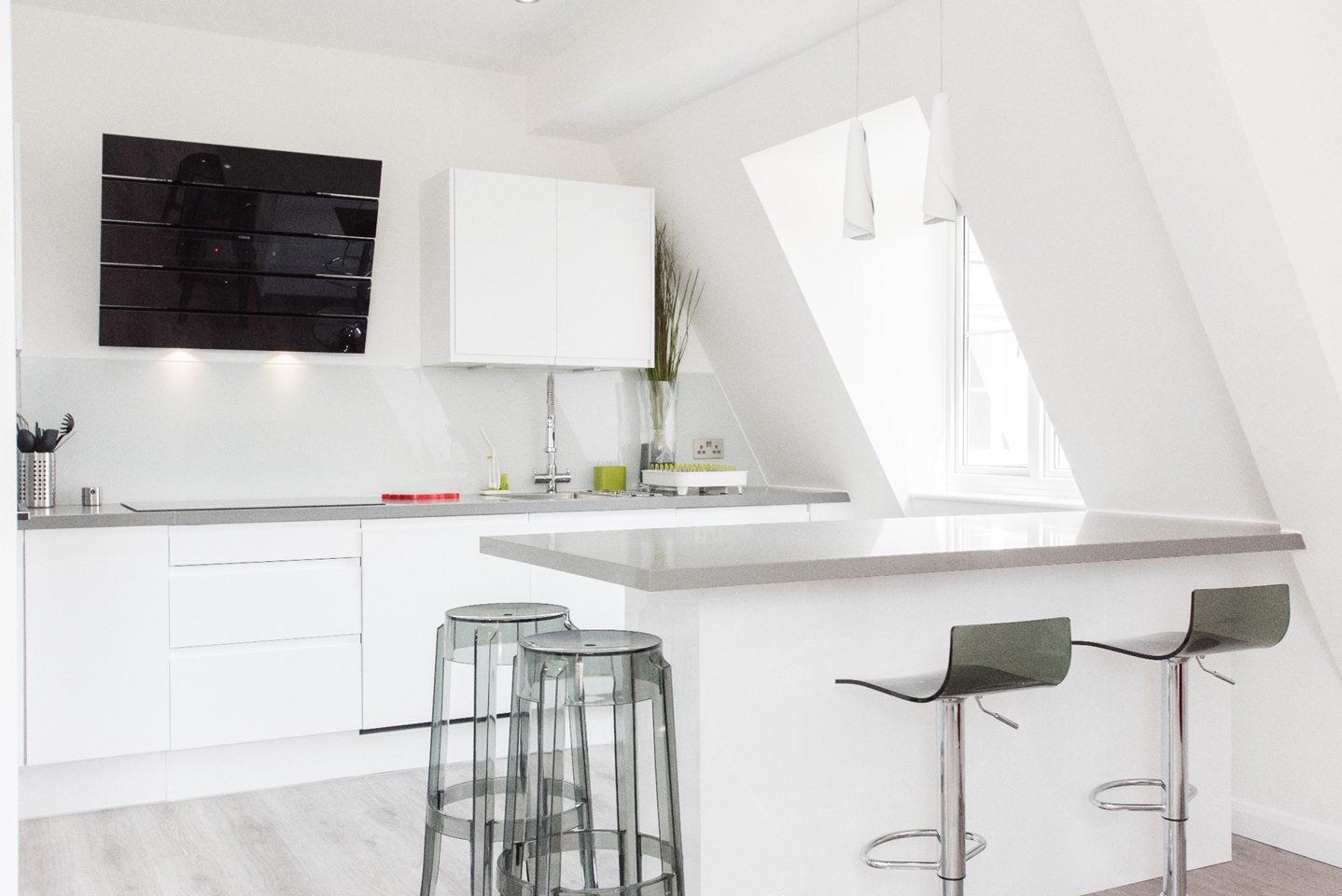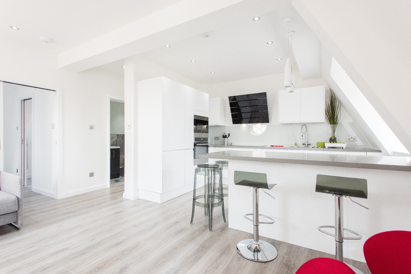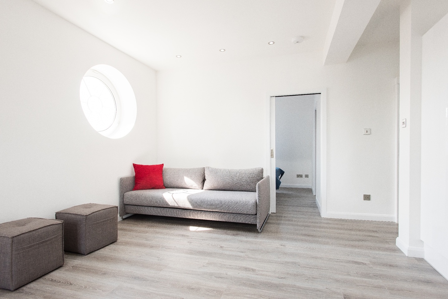 This apartment has very modern furnishings with crisp white walls and stylish tiling in the bathrooms. The living room is very bright and spacious with large windows giving the space a very airy feel. The open plan kitchen has all appliances neatly built into wall mounted cabinet. A kitchen bar sits right across the kitchen space with pendant lights hanging over. It's the perfect spot to perch up on for a morning cup of coffee or a yummy meal at the end of a long day of sightseeing around London. The kitchen is fully equipped with all your culinary requirements to ensure you can enjoy cooking your own meals to feel more at home. A brand new sofa adorns one side of the living room that you can pull out at night to have two additional people sleep, should you need the extra space.
