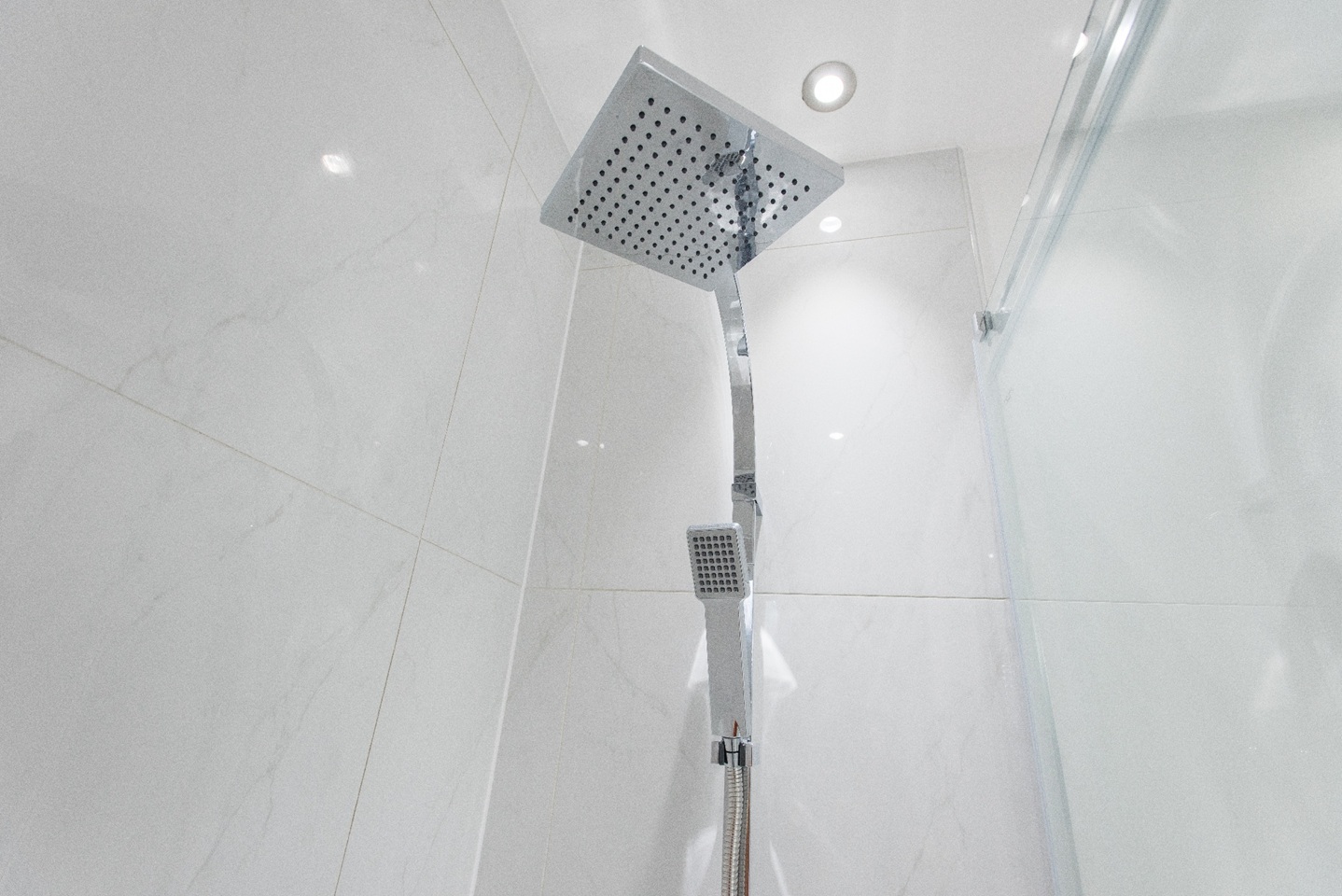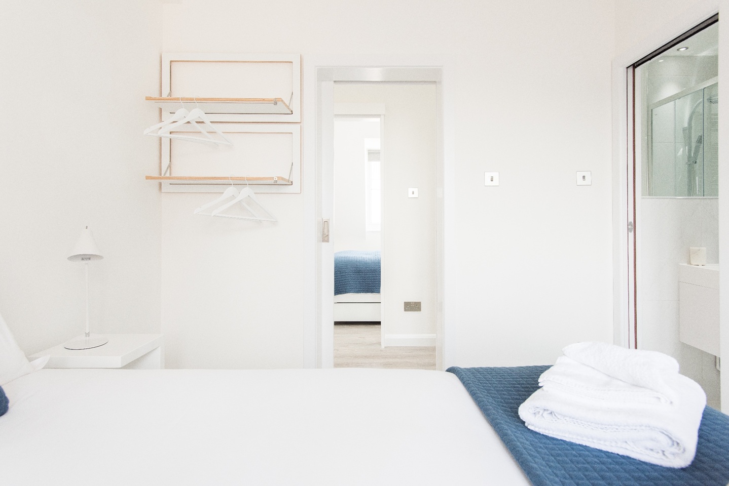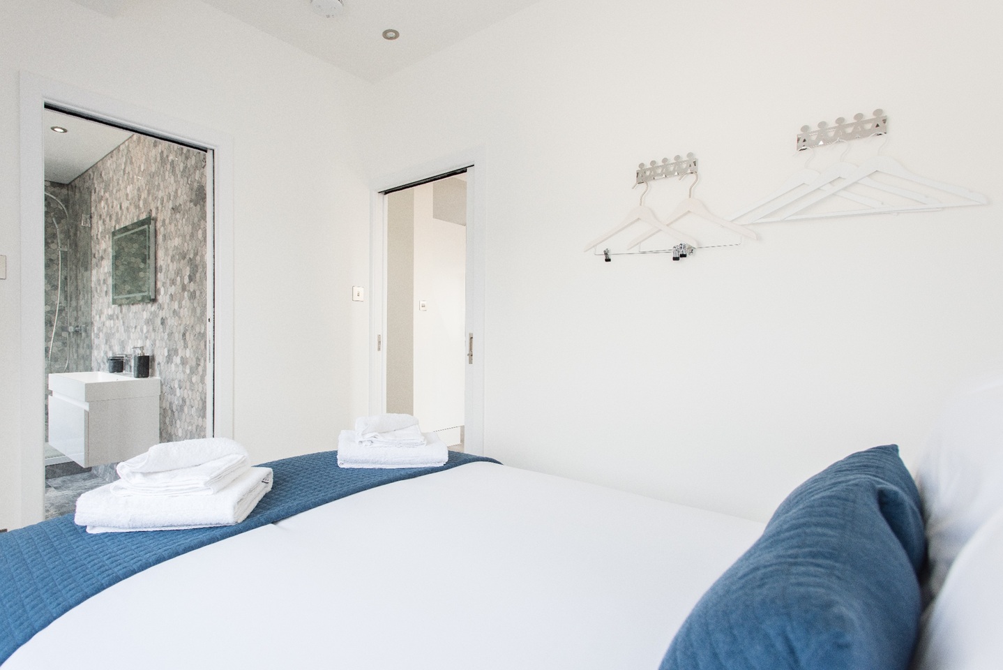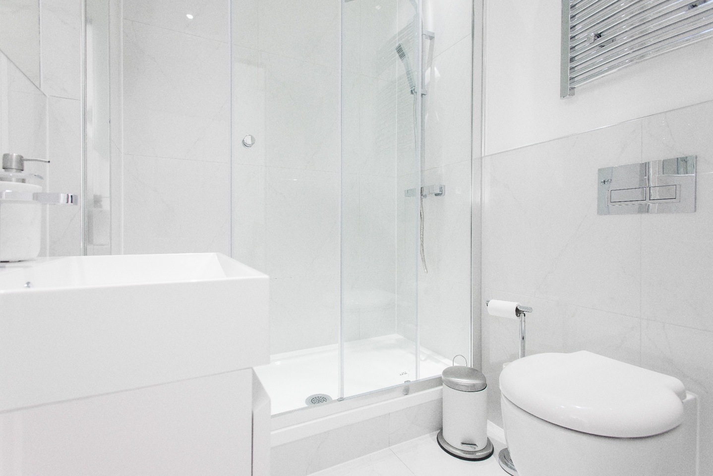All three bedrooms are furnished with king size beds, fluffy pillows and soft throws to ensure you have a very peaceful sleep at night. Built-in cabinets with sliding doors, give you plenty of space to store your belongings to enjoy a clutter free space during your stay. You will find plenty of hangers to hang your coats and jackets in the bedroom too. Two bedrooms have ensuite bathrooms best suited for couples. There is also a third full bathroom in the hallway for guests in the third bedroom or sleeping on the sofa bed. All bathrooms are of the highest quality with beautiful finishings and power showers. Located on the 5th floor of a building.
