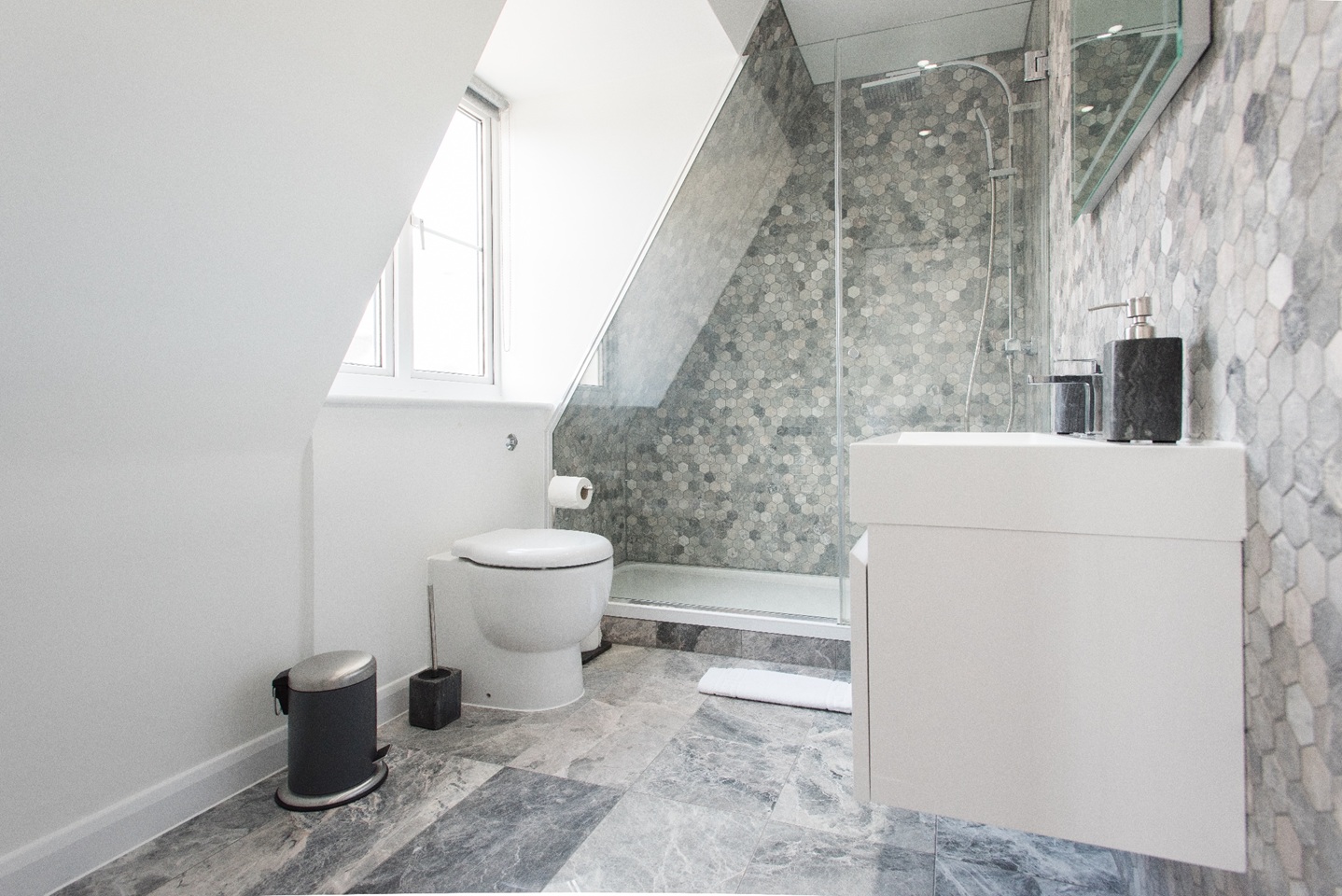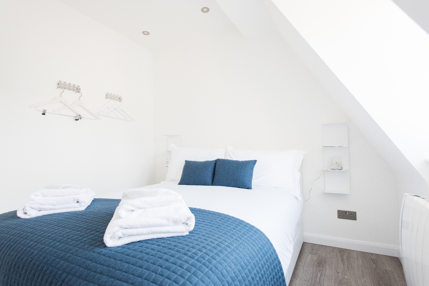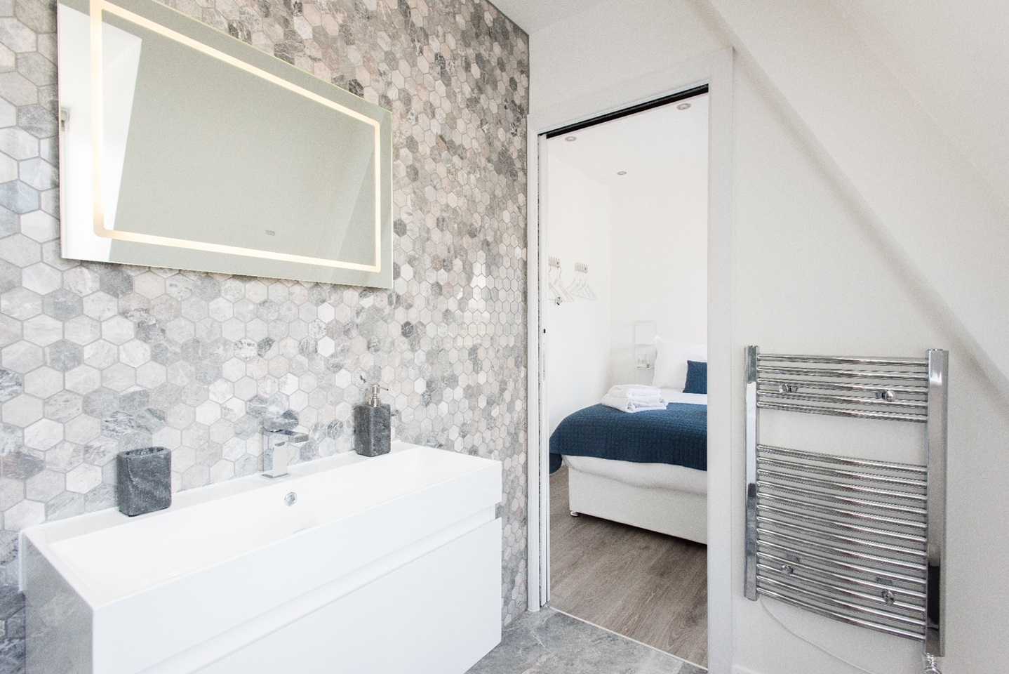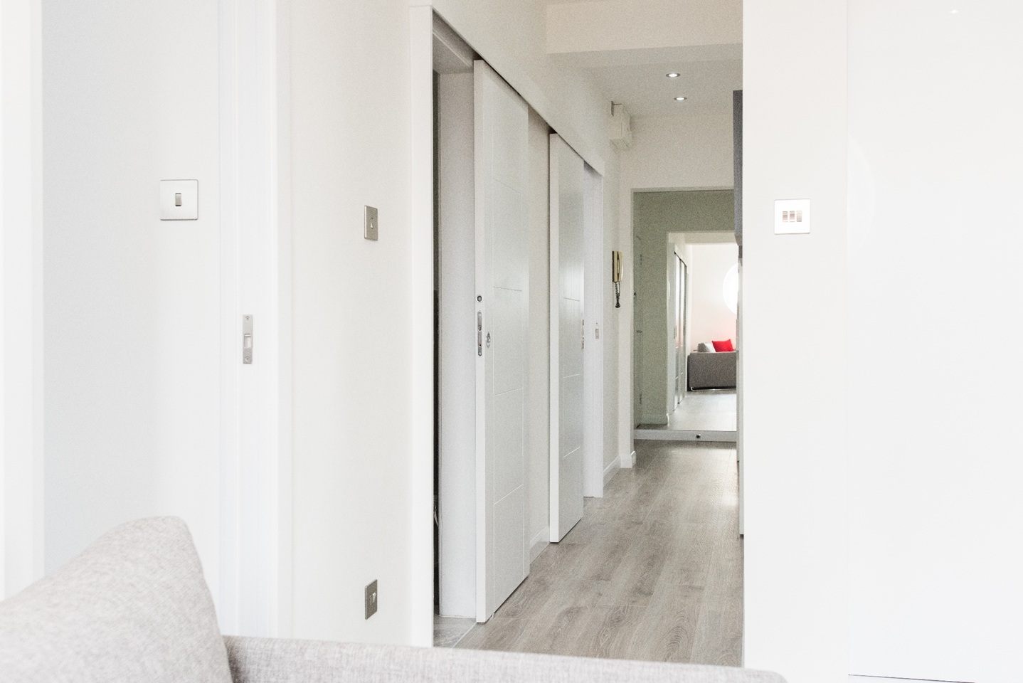 All three bedrooms are furnished with king size beds, fluffy pillows and soft throws to ensure you have a very peaceful sleep at night. Built-in cabinets with sliding doors, give you plenty of space to store your belongings to enjoy a clutter free space during your stay. You will find plenty of hangers to hang your coats and jackets in the bedroom too. Two bedrooms have ensuite bathrooms best suited for couples. There is also a third full bathroom in the hallway for guests in the third bedroom or sleeping on the sofa bed. All bathrooms are of the highest quality with beautiful finishings and power showers. Located on the 5th floor of a building.