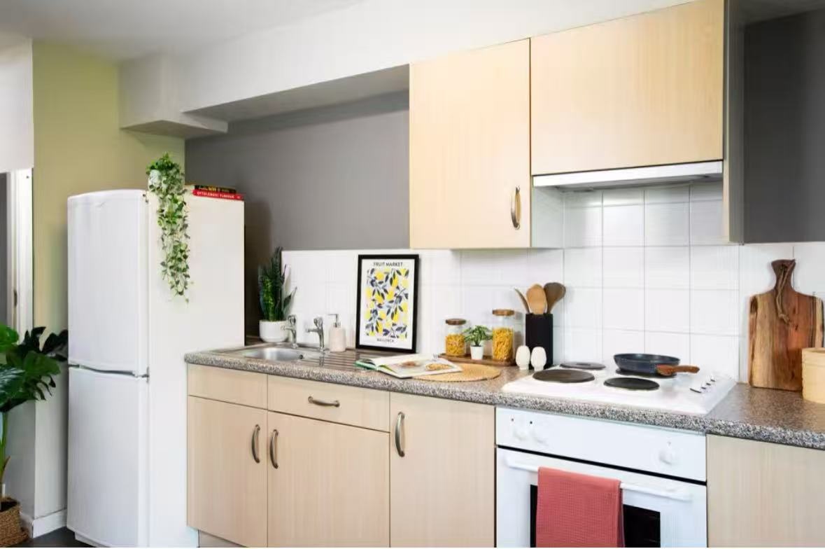 Five people share one kitchen (actually four), and they are all students. Key card access required when you enter the building so it is very safe.