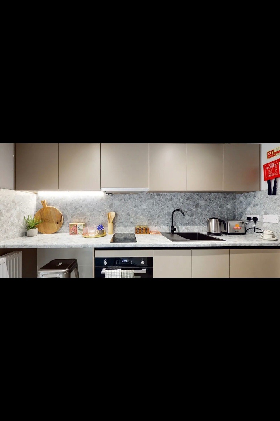 Spacious studio with double bed, private bathroom, TV, desk, wardrobe, radiator, underbed storage & private kitchenette with fridge/freezer.