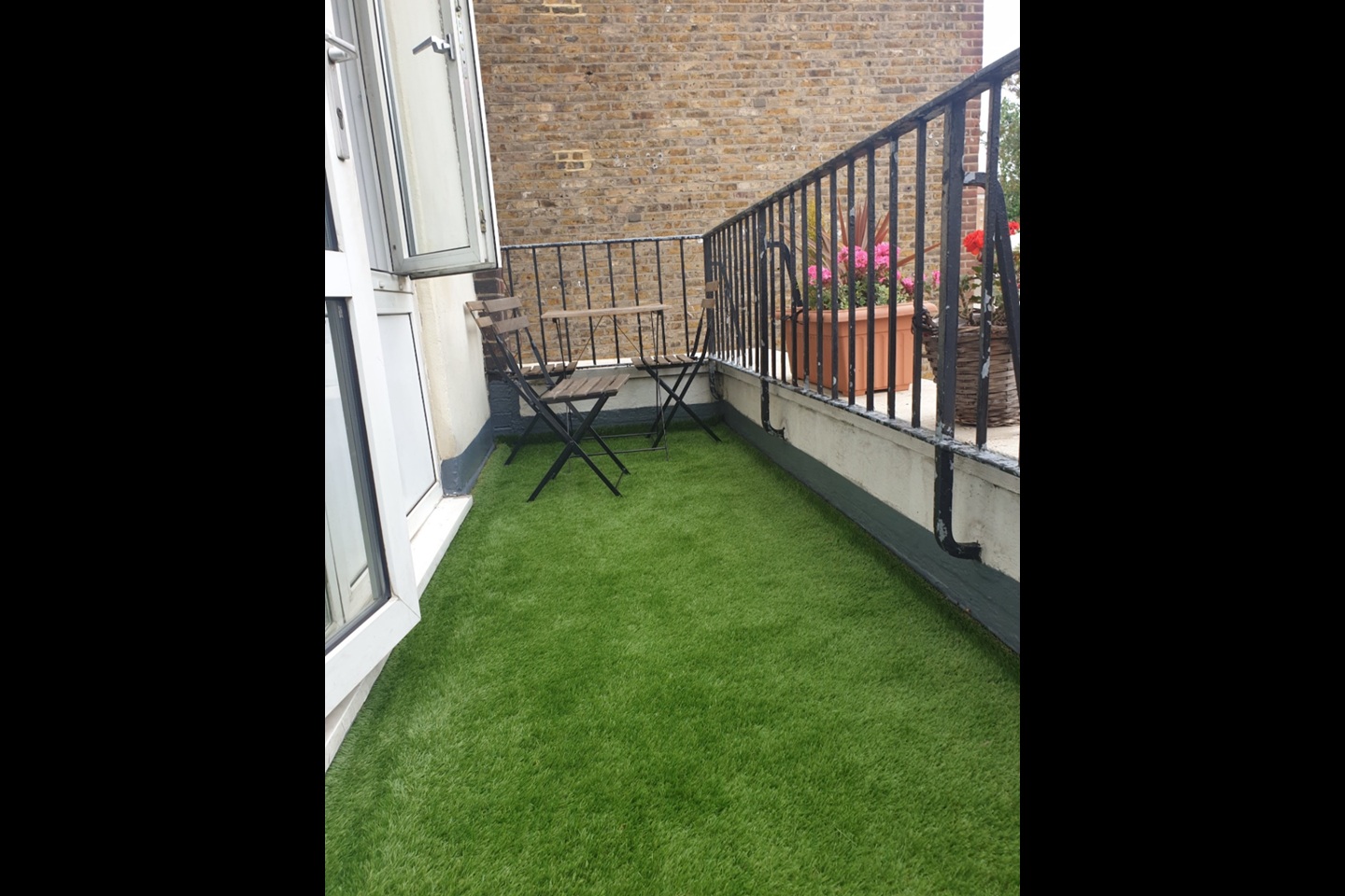The bedroom is fully decorated with furniture, including a double bed, desk, chair, mirrors, shelves, wardrobe, cabinet with four drawers, bedside, mini-fridge, a private living room and balcony with artificial grass.