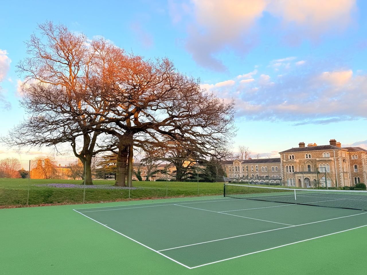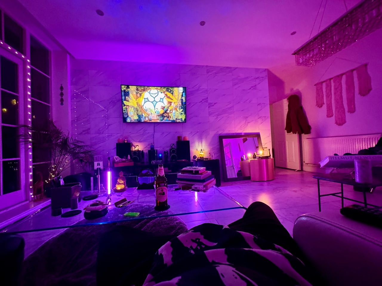 Set within 30 acres of private parkland, Princess Park Manor offers an exceptional lifestyle with exclusive access to a private health club, tennis courts, manicured gardens, and 24-hour gated security. The flat itself benefits from a beautifully designed lounge with bespoke furniture, mood lighting, and a curved TV — providing a warm, stylish setting.