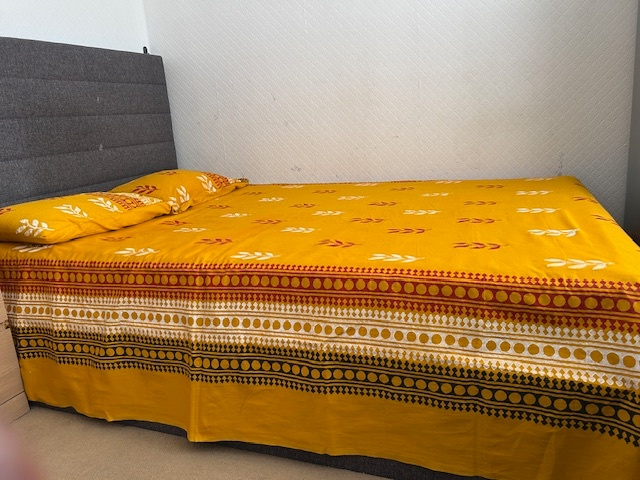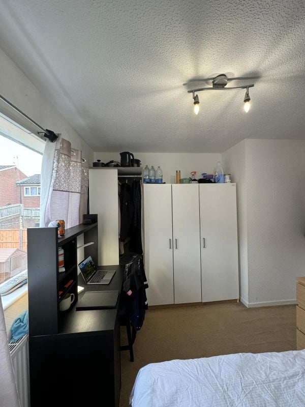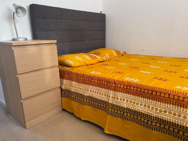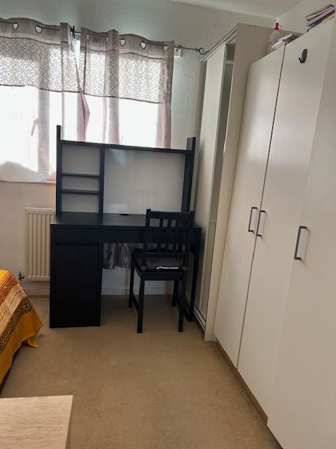 The room fully furnished with a large double-bed, bedside table, two cupboards (one large and one small) with plenty of storage space, including under-bed storage. The occupant would also have own fridge-freezer, reading table and chair. There is a small garden at the back to dry your clothes, store cycle etc., if needed.
