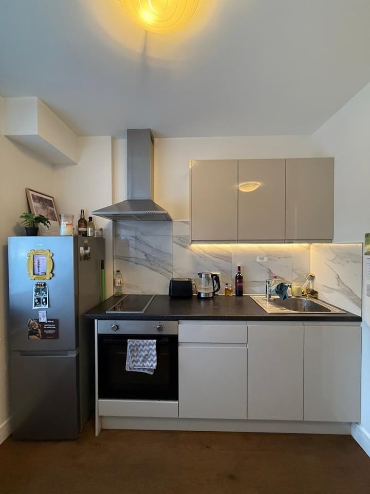Modern kitchen including oven, 2 burner hob and tower fridge-freezer.