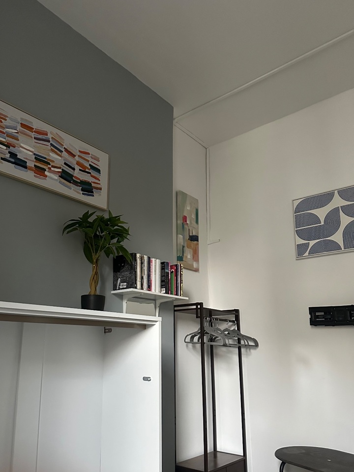 A bright studio flat within a period building, with natural light.