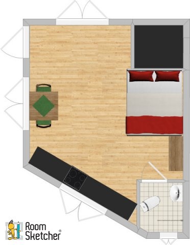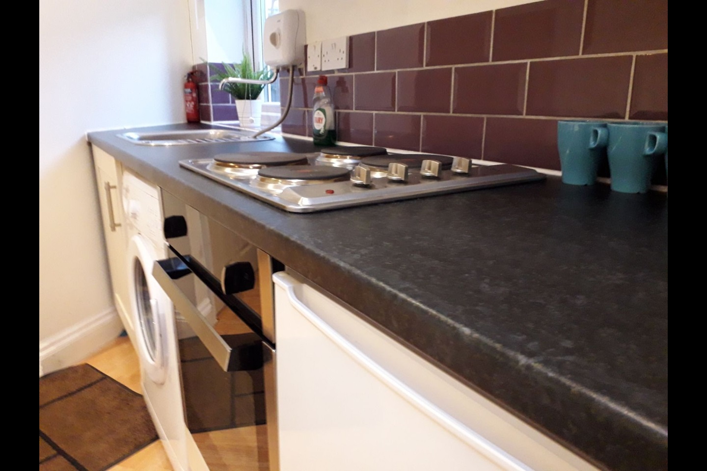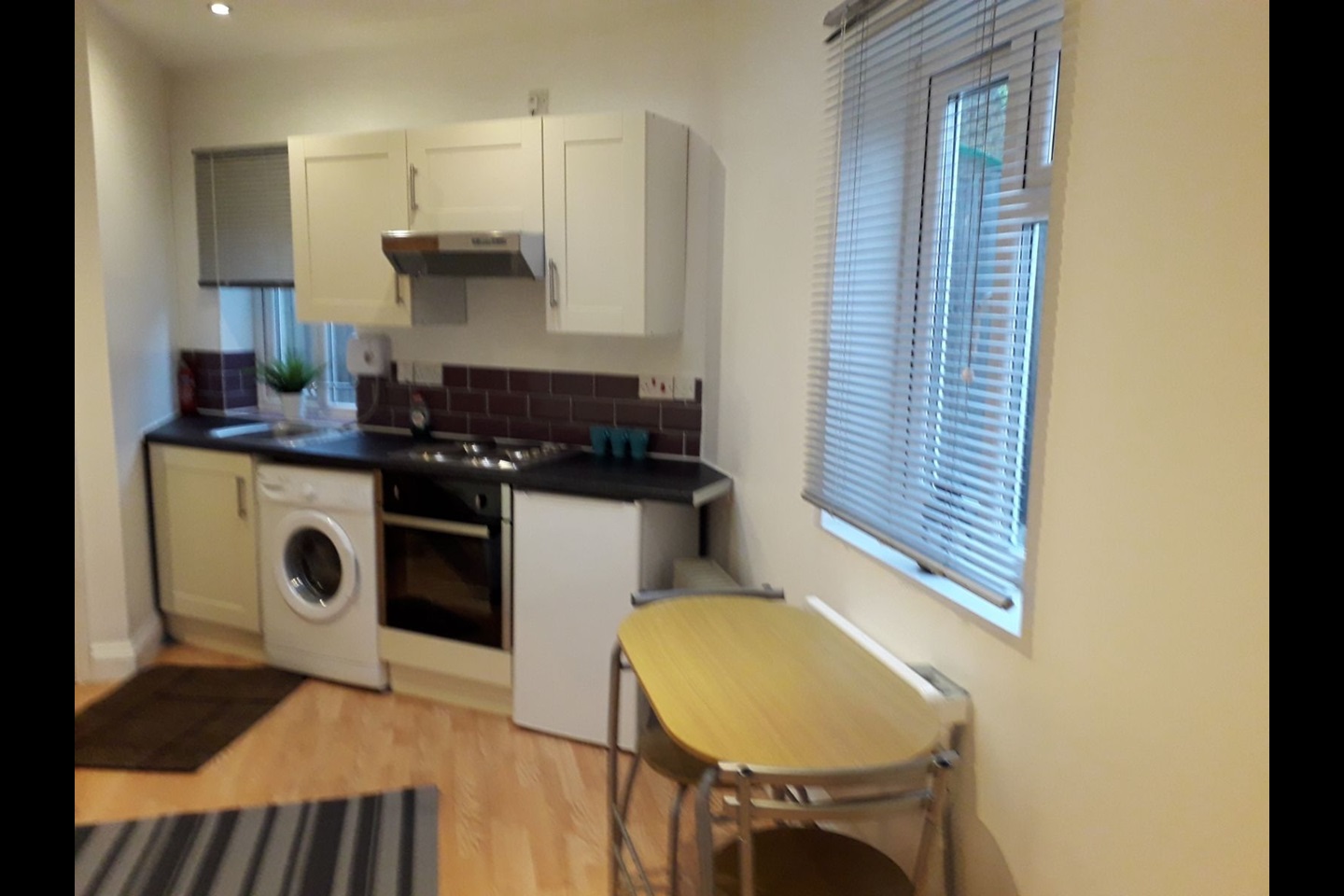 The studio comprises of a bathroom with walk-in shower, fully fitted kitchen with electrical hob and oven as well as an counter fridge and standalone washing machine.