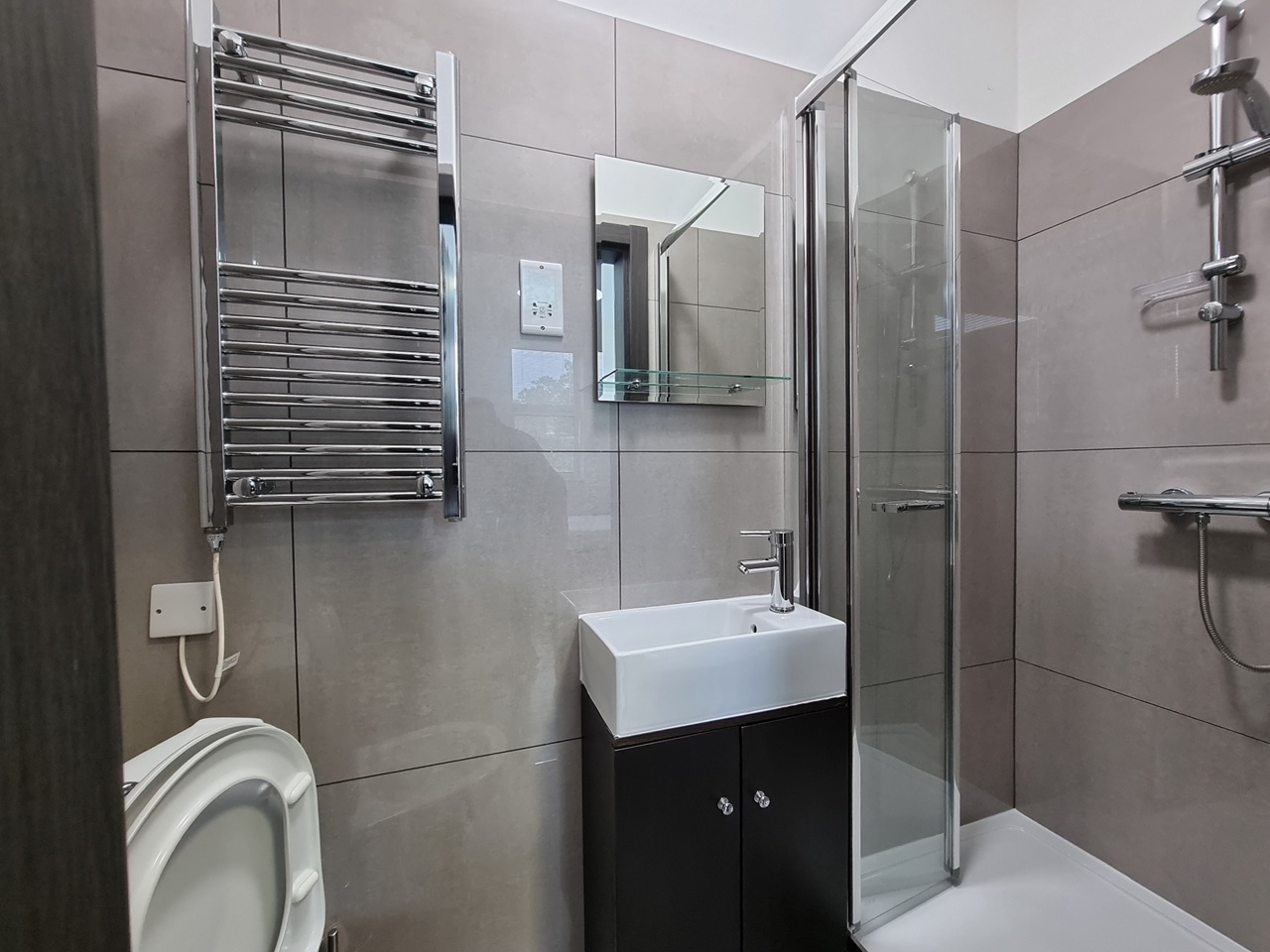 Modern En-Suite: A sleek, fully-tiled bathroom featuring a walk-in shower and a heated chrome towel rail.