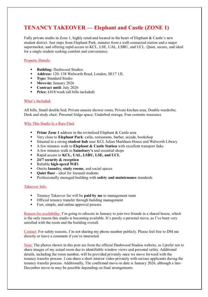 TENANCY TAKEOVER — Zone 1 Studio (Elephant & Castle)