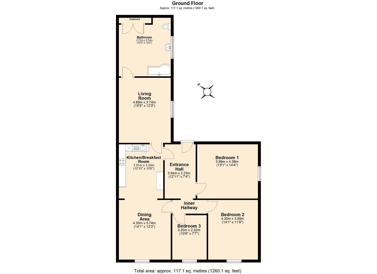 substantial first floor apartment situated in the heart of Long Bennington and recently benefiting from a refurbishment. The property is accessible from an external staircase into a spacious entrance hall. To the left of the entrance hall you have 3 generous and well proportioned bedrooms. The kitchen/diner offers enough space for dining table and sofa area. The living room is substantial and located directly off the kitchen and to the rear of the property. There’s also a newly fitted bathroom suite with shower over bath.