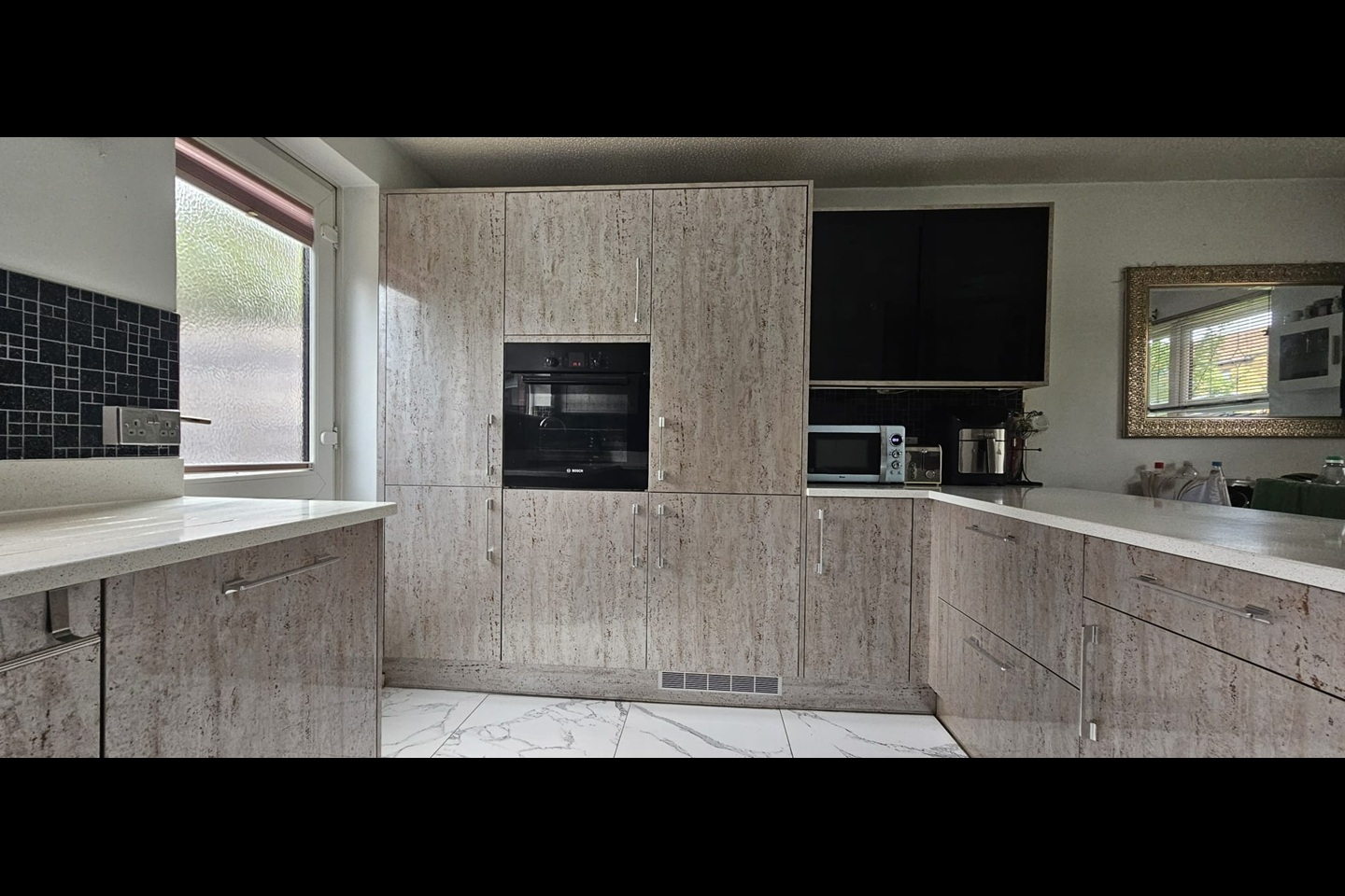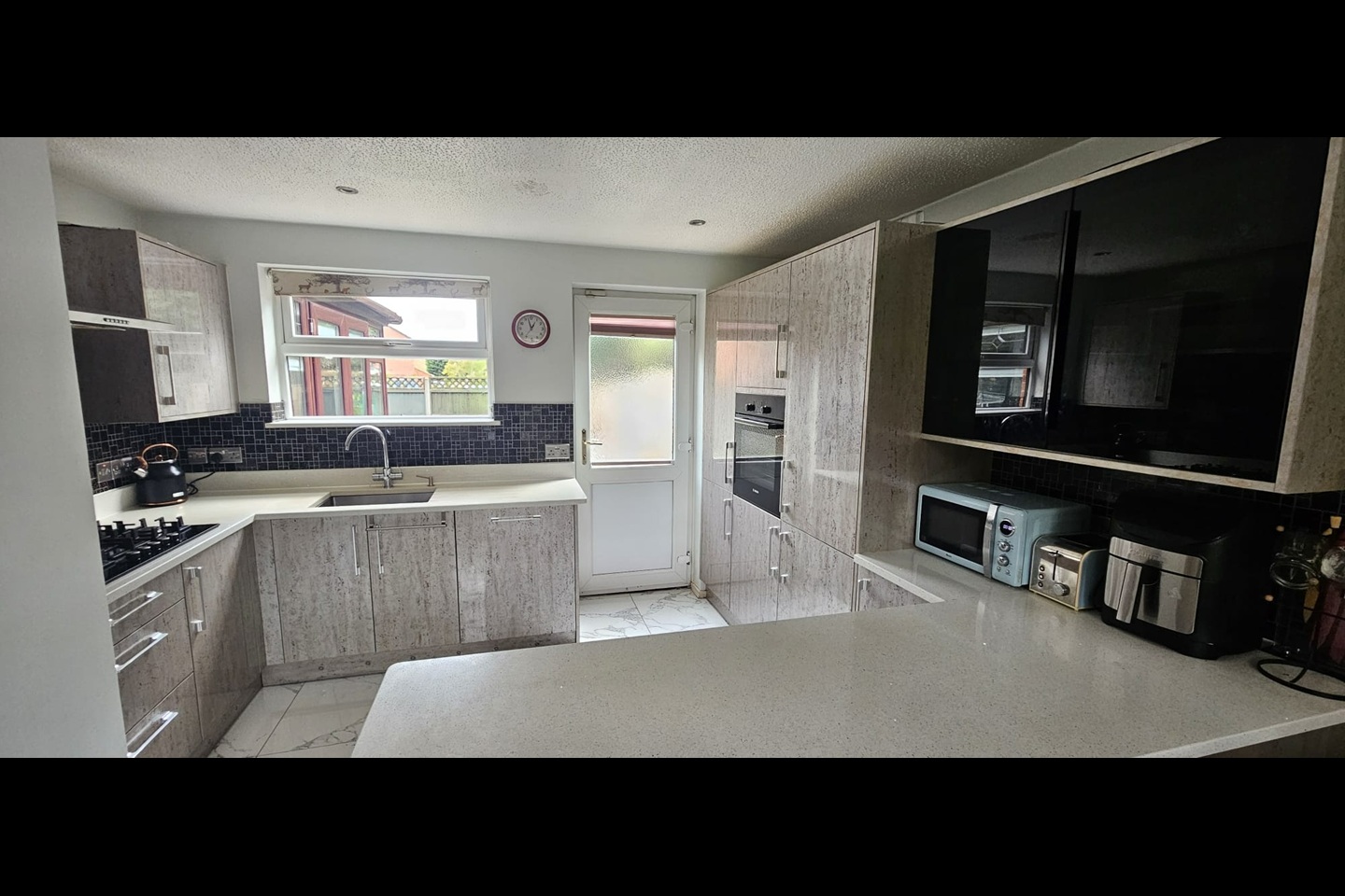 Modular and latest Fitted kitchen with integrated Hob, Dishwasher, Fridge/Freezer and Oven. Washing machine and Tumble dryer
