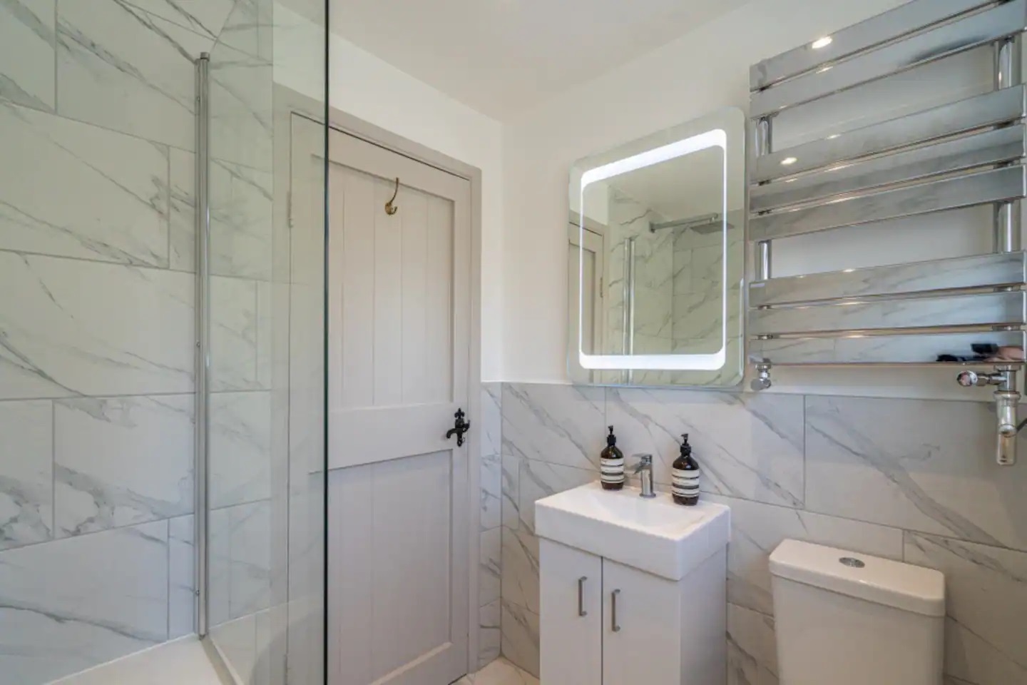 Luxury bathroom with underfloor heating and bath with built in shower.
