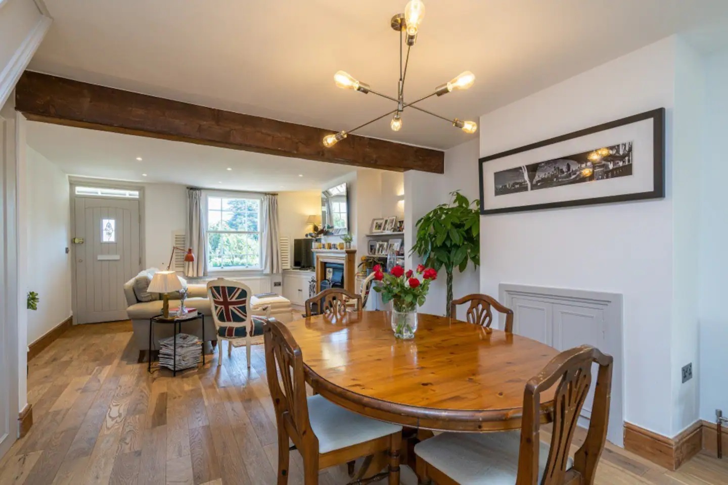 Open plan sitting room/dining room with wooden flooring, feature fireplace, leading to superb fully fitted kitchen with integrated appliances including: dishwasher and Nespresso (vertuo) coffee machine.
