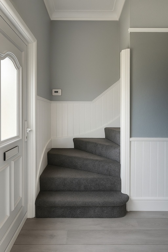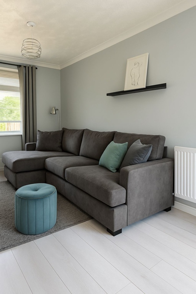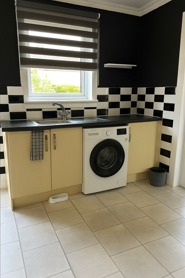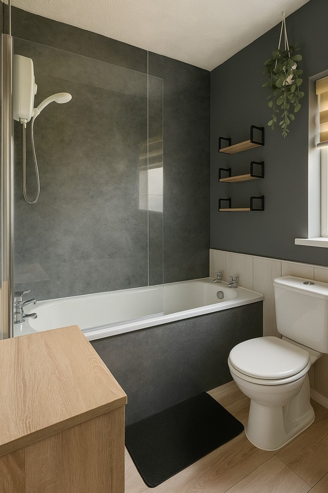 Elegantly finished in a modern grey palette, the bathroom offers both style and practicality.