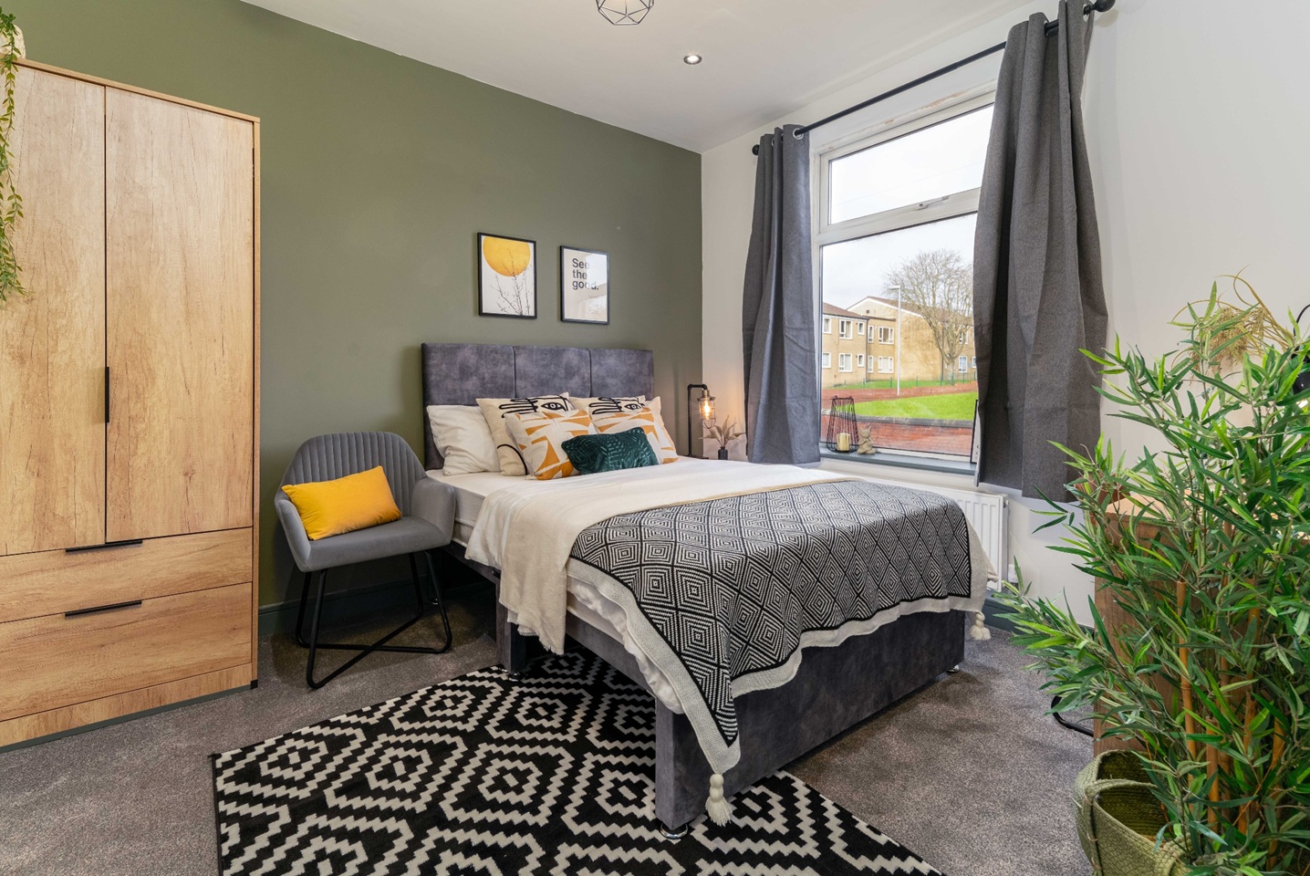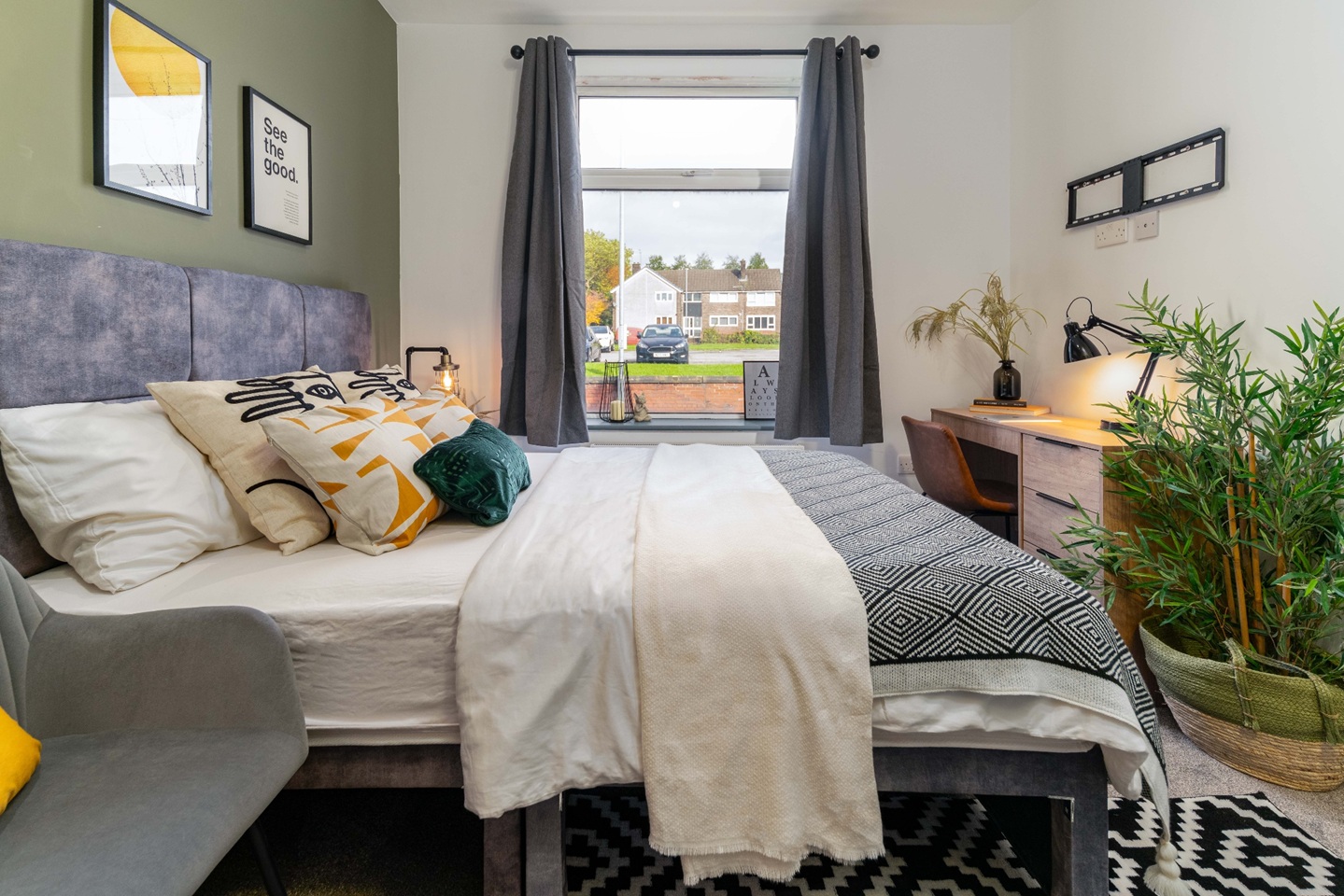 A bright, stylish space with a double bed, wardrobe, desk, and bedside table - everything you need to move straight in.
