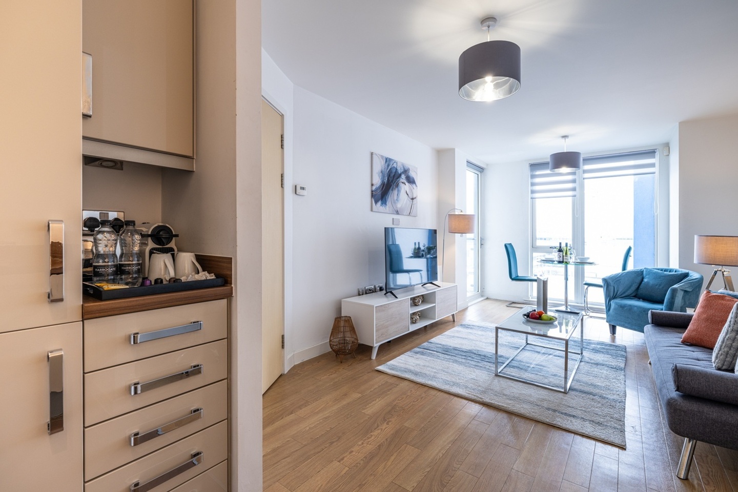 A clean and modern 1-bedroom apartment featuring floor-to-ceiling windows and fully furnished with everything you need for a comfortable home-away-from-home stay.