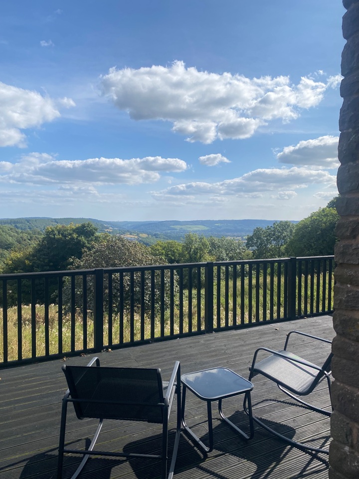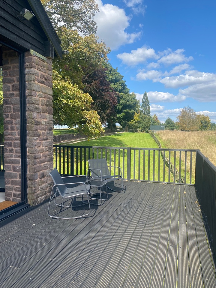The property comprises of: a split level open plan living room with wood-burner and full height doors opening to a large balcony with extensive views over Monmouth. A dining area with a glass table and 4 chairs plus a desk, office chair and bookcases. To the rear of the room is a wardrobe which divides off the sleeping area - it's quite compact but houses a king-sized bed and bedside cabinets. In a separate room is a newly fitted modern kitchen with dishwasher and a small but attractive shower room.