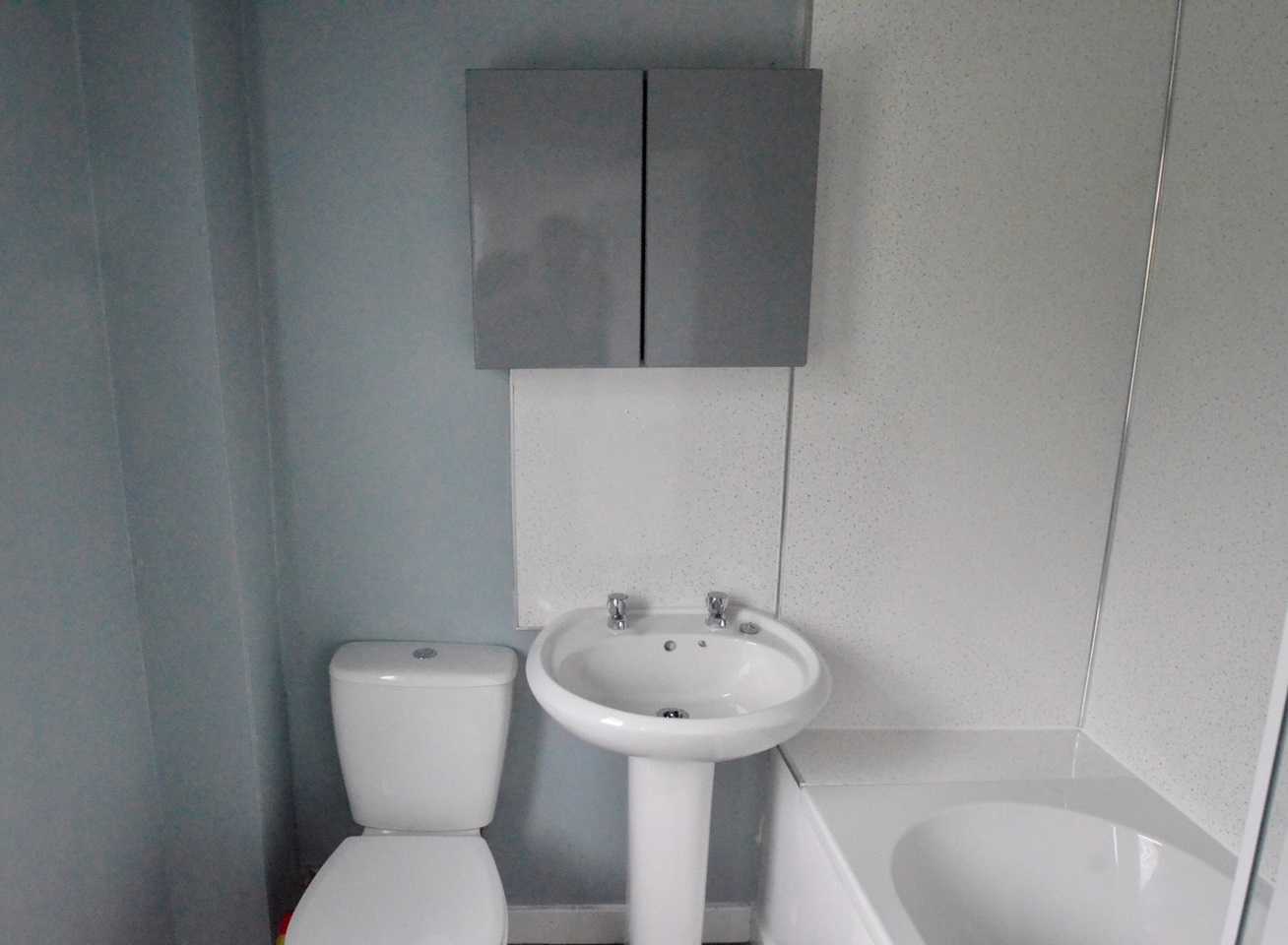 Bathroom with a white suite of W.C. Wash hand basin and bath with electric shower over.