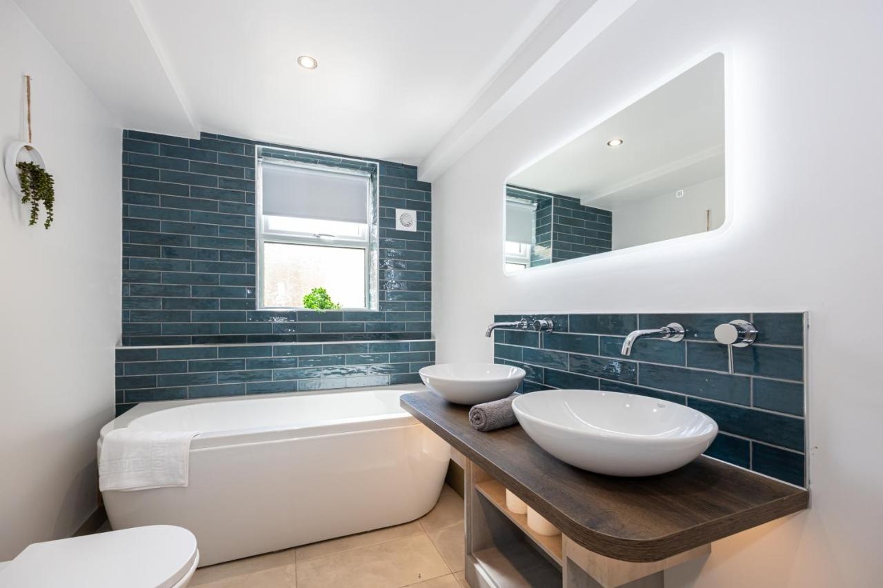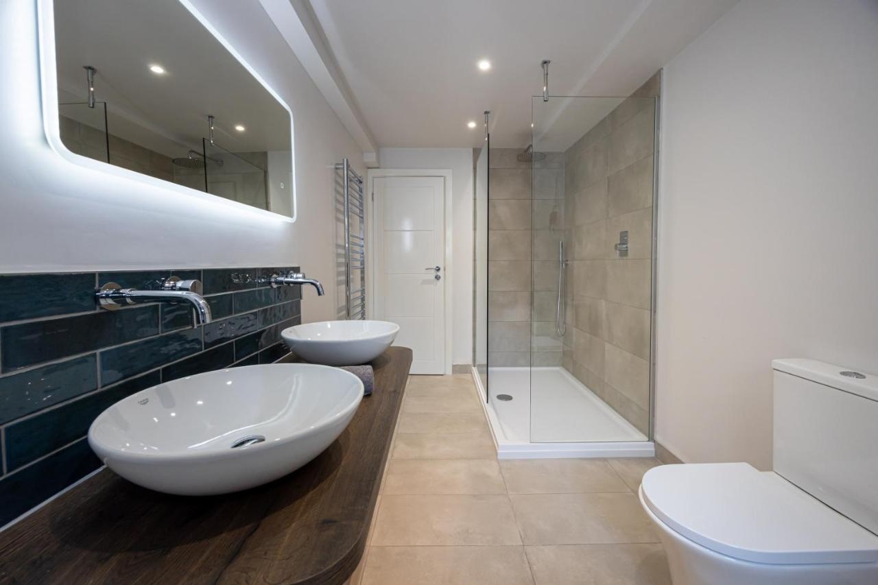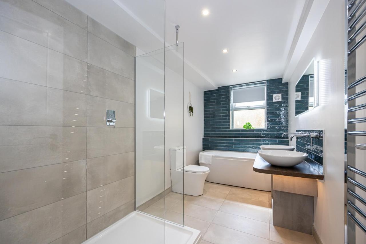 The large bathroom includes double sinks, a full free standing bath and a large and powerful rainfall walk in shower.