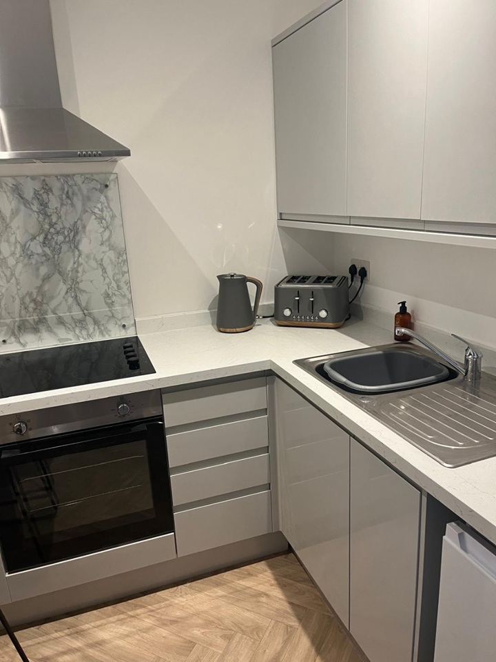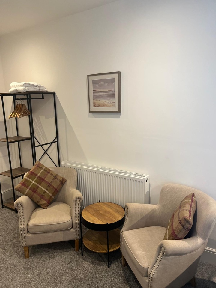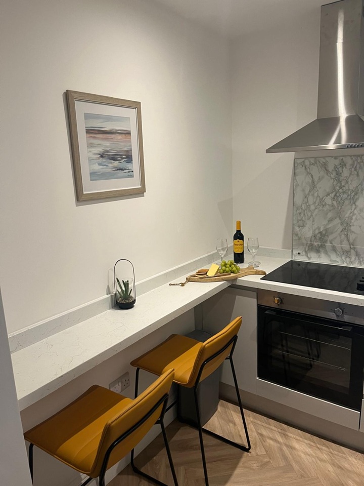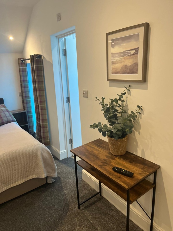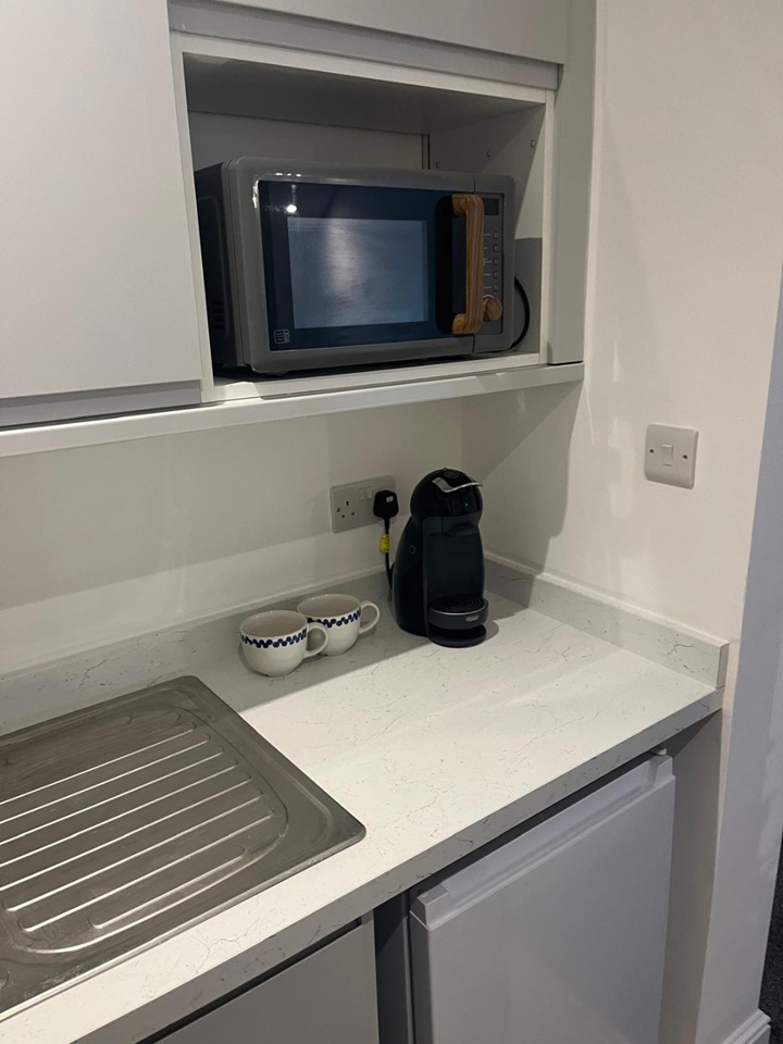 The beautifully designed kitchen area is equipped for your culinary needs, complete with a kettle, toaster, microwave, and fridge, making it easy to prepare simple meals.