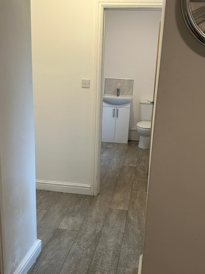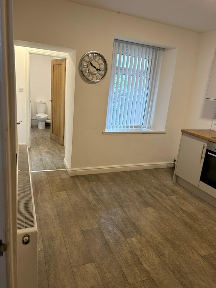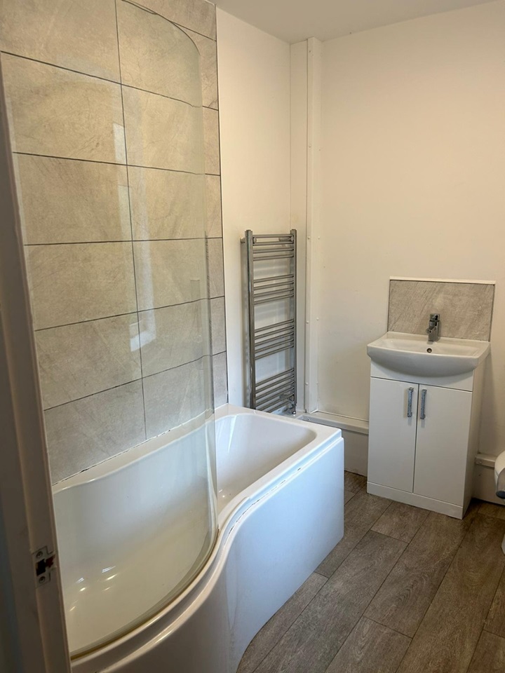 Through to the back of the house, you will find the family bathroom, comprising a toilet, basin and bath, with an over-the-bath shower complete with a glass shower screen and a chrome towel radiator. This bathroom is tastefully decorated with white walls, grey stone tiles and grey wood-effect lino. Comes complete with vertical blinds.