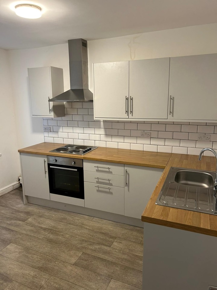 A great-sized kitchen comes complete with grey units with plenty of cupboards and drawers, a hardwood countertop, and an integrated cooker, oven and extractor fan, with plenty of space for white goods.