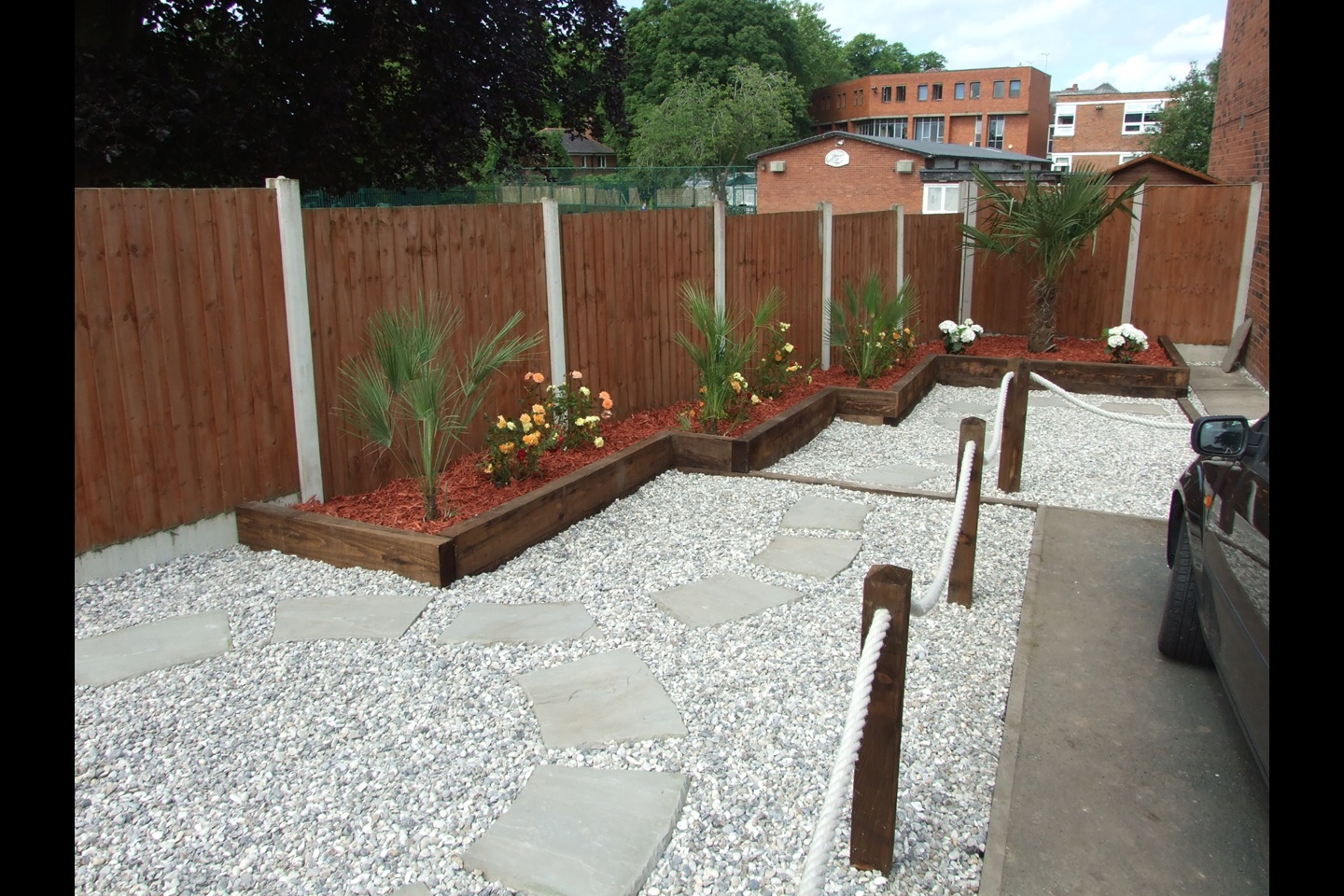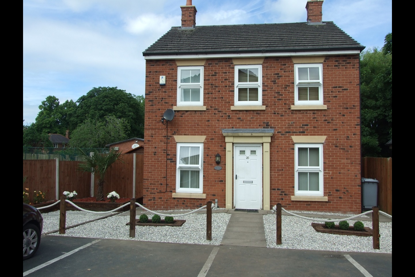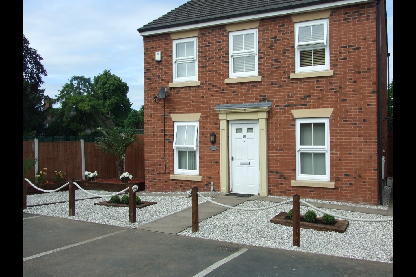 To the front are strikingly looking low-maintenance landscaped gardens in a unique design, featuring a winding paths and raised sleeper beds with multi-coloured roses and dwarf palms. Off-road parking exists in the form of dedicated parking bays for two cars.